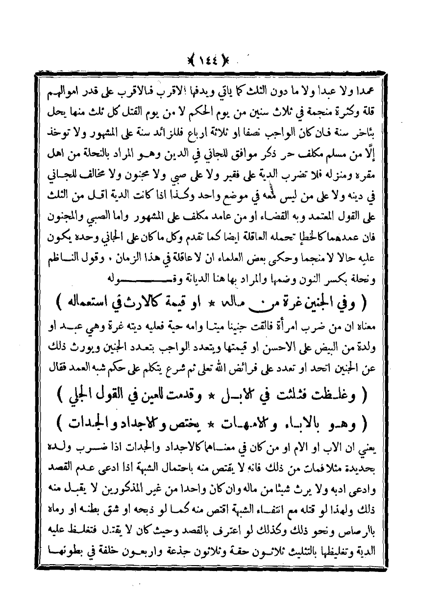 عمدا ولا عبدا ولا ما دون الثلث كما يأتي ويدفها الأقرب فالأقرب على قدر أموالهم قلة وكثرة منجمة في ثلاث سنين من يوم الحكم لا من يوم القتل كل ثلث منها يحل بأخر سنة فإن كان الواجب نصفا أو ثلاثة أرباع فللزائد سنة على المشهور ولا تؤخذ إلا من مسلم مكلف حر ذكر موافق للجاني في الدين وهو المراد بالنحلة من أهل مقره ومنزله فلا تضرب الدية على فقير ولا على صبي ولا مجنون ولا مخالف للجاني في دينه ولا على من ليس معه في موضع واحد وكذا إذا كانت الدية أقل من الثلث على القول المعتمد وبه القضاء أو من عامد مكلف على المشهور وأما الصبي والمجنون فإن عمدهما كالخطأ تحمله العاقلة أيضا كما تقدم وكل ما كان على الجاني وحده يكون عليه حالا لا منجما وحكى بعض العلماء أن لا عاقلة في هذا الزمان. وقول الناظم ونحلة بكسر النون وضمها والمراد بها هنا الديانة وقوله