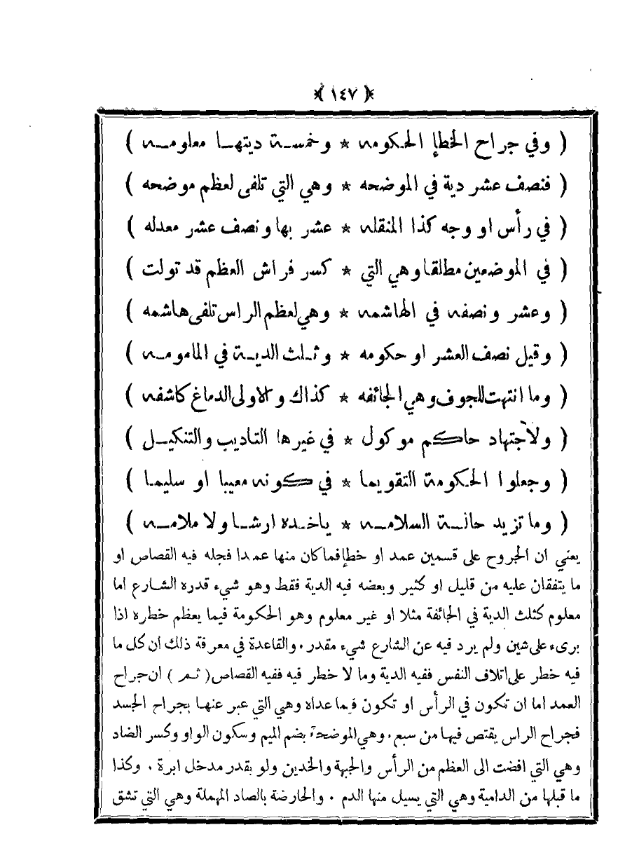 (وفي جراح الخطأ الحكومة ... وخمسة ديتها معلومة)