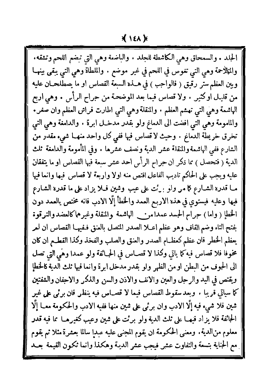 الجلد. والسمحاق وهي الكاشطة للجلد. والباضعة وهي التي تبضع اللحم وتشقه. والمتلاحمة وهي التي تغوص في اللحم في غير موضع. والملطاة وهي التي يبقى بينها وبين العظم ستر رقيق (فالواجب) في هذه السبعة القصاص أو ما يصطلحان عليه من قليل أو كثير. ولا قصاص فيما بعد الموضحة من جراح الرأس. وهي أربع الهاشمة وهي التي تهشم العظم. والمنقلة وهي التي أطارت فراش العظم وإن صغر. والمأمومة وهي التي أفضت إلى الدماغ ولو بقدر مدخل إبرة. والدامغة وهي التي تخرق خريطة الدماغ. وحيث لا قصاص فيها ففي كل واحد منها شيء مقدر من الشارع ففي الهاشمة والمنقلة عشر الدية ونصف عشرها. وفي المأمومة والدامغة ثلث الدية (فتحصل) مما ذكر أن جراح الرأس أحد عشر سبعة فيها القصاص أو ما يتفقان عليه ويجب على الحاكم تأديب الفاعل اقتص منه أولا وأربعة لا قصاص فيها وإنما فيها ما قدره الشارع كما مر ولو؟ ؟ ؟ على عيب وشين فلا يزاد على ما قدره الشارع فيها وعليه فيستوي في هذه الأربع العمد والخطأ إلا الأدب فإنه مختص بالعمد دون الخطأ (وأما) جراح الجسد عمدا من الهاشمة والمنقلة وغيرهما كالعضد والترقوة بفتح التاء وضم القاف وهو عظم أعلا الصدر المتصل بالعنق ففيها القصاص إن لم يعظم الخطر فإن عظم كعظام الصدر والعنق والصلب والفخذ وكذا القطع إن كان مخوفا فلا قصاص فيه كما يأتي وكذا لا قصاص في الجائفة ولو عمدا وهي التي تصل إلى الجوف من البطن أو من الظهر ولو بقدر مدخل إبرة وإنما فيها ثلث الدية كالخطأ ويقتص في اليد والرجل والعين والأنف والأذن والسن والذكر والأجفان والشفتين كما سيأتي قريبًا. وبعد سقوط القصاص فيما قصاص فيه ينظر فإن برئي على غير شين فلا شيء فيه إلا الأدب وأن برئي على شين منها ففيه الأدب والحكومة معًا إلا الجائفة فلا يزاد فيها على ثلث الدية ولو برئت على شين وعيب كغيرها مما فيه قدر معلوم من الدية. ومعنى الحكومة أن يقوم المجني عليه عبدًا سالمًا بعشرة مثلا ثم يقوم مع الجناية بتسعة والتفاوت عشر فيجب عشر الدية وهكذا وإنما تكون القيمة بعد