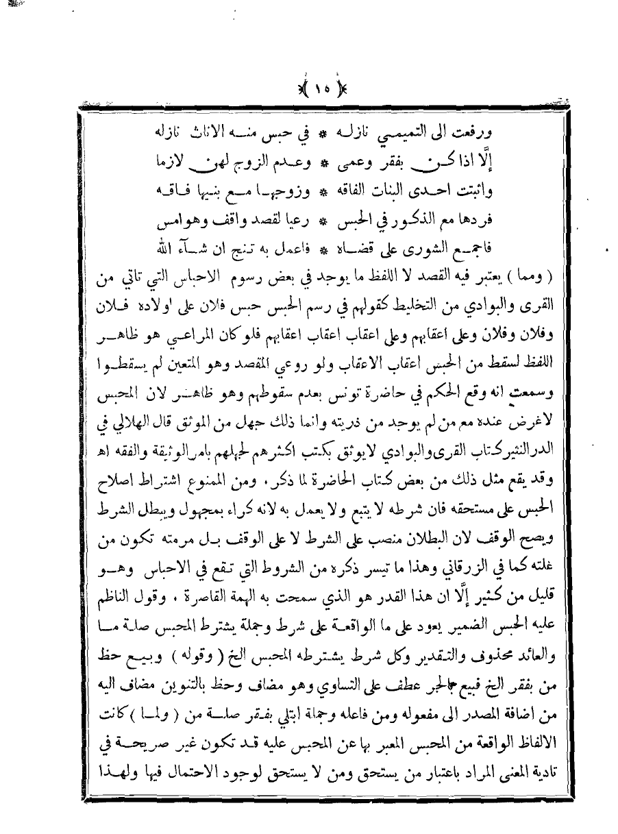 (ومما) يعتبر فيه القصد لا اللفظ ما يوجد في بعض رسوم الأحباس التي تأتي من القرى والبوادي من التخليط كقولهم في رسم الحبس حبس فلان على أولاده فلان وفلان وفلان وعلى أعقابهم وعلى أعقاب أعقاب أعقابهم فلو كان المراعي هو ظاهر اللفظ لسقط من الحبس أعقاب الأعقاب ولو روعي المقصد وهو المتعين لم يسقطوا وسمعت أنه وقع الحكم في حاضرة تونس بعدم سقوطهم وهو ظاهر لأن المحبس لأغراض عنده مع من لم يوجد من ذريته وإنما ذلك جهل من الموثق قال الهلالي في الدر النثير كتاب القرى والبوادي لا يوثق بكتب أكثرهم لجهلهم بأمر الوثيقة والفقه اهـ وقد يقع مثل ذلك من بعض كتاب الحاضر لما ذكر. ومن الممنوع اشتراط إصلاح الحبس على مستحقه فإن شرطه لا يتبع ولا يعمل به لأنه كراء بمجهول ويبطل الشرط ويصح الوقف لأن البطلان منصب على الشرط لا على الوقف بل مرمته تكون من غلته كما في الزرقاني وهذا ما تيسر ذكره من الشروط التي تقع في الأحباس وهو قليل من كثير إلا إن هذا القدر هو الذي سمحت به الهمة القاصرة. وقول الناظم عليه الحبس الضمير يعود على ما الواقعة على شرط وجملة يشترط المحبس صلة ما والعائد محذوف والتقدير وكل شرط يشترطه المحبس الخ (وقوله) وبيع حظ من بفقر الخ فبيع بالجر عطف على التساوي وهو مضاف وحظ التنوين مضاف إليه من إضافة المصدر إلى مفعوله ومن فاعله وجملة ابتلي بفقر صلة من (ولما) كانت الألفاظ الواقعة من المحبس المعبر بها عن المحبس عليه قد تكون غير صريحة في تأدية المعنى المراد باعتبار من يستحق ومن لا يستحق لوجود الاحتمال فيها ولهذا