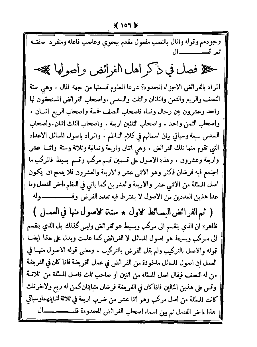 المراد بالفرائض الأجزاء المحدودة شرعًا المعلوم قسمتها من جهة المال. وهي ستة النصف والربع والثمن والثلثان والثلث والسدس. وأصحاب الفرائض المستحقون لها واحد وعشرون بين رجال ونساء فأصحاب النصف خمسة وأصحاب الربع اثنان. وأصحاب الثمن واحد. وأصحاب الثلثين أربعة. وأصحاب الثلث اثنان. وأصحاب السدس سبعة وسيأتي بيان أسمائهم في كلام الناظم. والمراد بأصول المسائل الأعداد التي تقوم منها تلك الفرائض. وهي اثنان وأربعة وثمانية وثلاثة وستة واثنا عشر وأربعة وعشرون. وهذه الأصول على قسمين قسم مركب وقسم بسيط فالمركب ما اجتمع فيه فرضان فأكثر وهو الاثنى عشر والأربعة والعشرون فلا يصح أن يكون أصل المسألة من الاثنى عشر والأربعة والعشرين كما يأتي في النظم أخر الفصل وما عدا هذين العددين من الأصول لا يشترط فيه تعدد الفرض وقوله