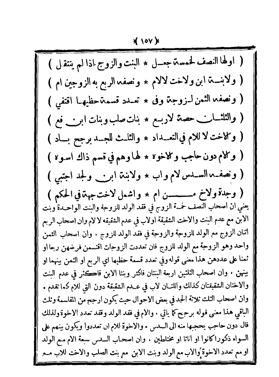 يعني أن أصحاب النصف خمسة الزوج في فقد الولد للزوجة والبنت الواحدة وبنت الابن مع عدم البنت والأخت الشقيقة أو لأب في عدم الشقيقة لا لأم وأن أصحاب الربع اثنان الزوج مع الولد للزوجة والزوجة في فقد الولد للزوج. وأن أصحاب الثمن واحد وهو الزوجة مع الولد للزوج فإن تعددت الزوجات اقتسمن فرضهن ربعا أو ثمنا على عددهن هذا معنى قوله وفي تعدد قسمة حظيها أي الربع أو الثمن بينهما أو بينهن. وأن أصحاب الثلثين أربعة البنتان فأكثر وبنتا الابن فأكثر في عدم البنت والأختان الشقيقتان كذلك واللتان لأب في عدم الشقيقة دون التي للأم كما تقدم. وأن أصحاب الثلث ثلاثة الجد في بعض الأحوال حيث يكون أرجح من المقاسمة وثلث الباقي هذا معنى قوله برجح كما يأتي. والأم في فقد الولد وفقد تعدد الأخوة ولذلك قال دون حاجب يحجبها منه إلى السدس. والأخوة للأم أن تعددوا ويكون بينهم على السواء ذكورًا كانوا أو إناثا أو مختلطين. وأن أصحاب السدس سبعة الأم مع الولد أو مع تعدد الأخوة والأب مع الولد وبنت الابن مع بنت الصلب والأخت للأب مع
