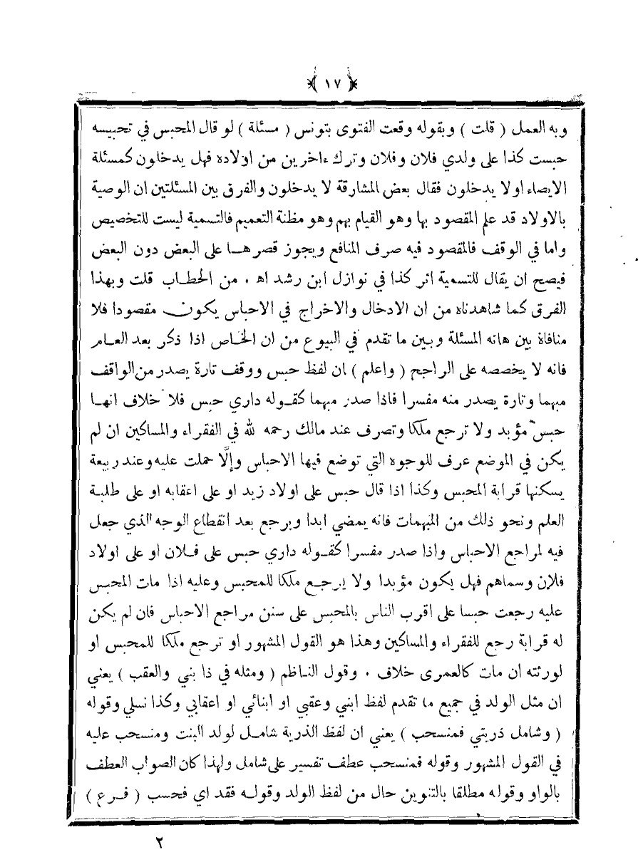 وبه العمل (قلت) وبقوله وقعت الفتوى بتونس (مسألة) لو قال المحبس في تحبيسه حبست كذا على ولدي فلان وفلان وترك آخرين من أولاده فهل يدخلون كمسألة الإيصاء أولا يدخلون فقال بعض المشارقة لا يدخلون والفرق بين المسألتين أن الوصية بالأولاد قد علم المقصود بها وهو القيام بهم وهو مظنة التعميم فالتسمية ليست للتخصيص وأما الوقف فالمقصود فيه صرف المنافع ويجوز قصرها على البعض دون البعض فيصح أن يقال للتسمية أثر كذا في نوازل ابن رشد اهـ. من الحطاب قلت وبهذا الفرق كما شاهدناه من أن الإدخال والإخراج في الأحباس يكون مقصودًا فلا منافاة بين هاته المسألة وبين ما تقدم في البيوع من أن الخاص إذا ذكر بعد العام فإنه لا يخصصه على الراجح (واعلم) أن لفظ حبس ووقف تارة يصدر من الواقف مبهمًا وتارة يصدر منه مفسرًا فإذا صدر مبهمًا كقوله داري حبس فلا خلاف إنها حبس مؤبد ولا ترجع ملكًا وتصرف عند مالك رحمه الله في الفقراء والمساكين إن لم يكن في الموضع عرف للوجوه التي توضع فيها الأحباس وإلا حملت عليه وعند ربيعة يسكنها قرابة المحبس وكذا إذا قال حبس على أولاد زيد أو على أعقابه أو على طلبة العلم ونحو ذلك من المبهمات فإنه يمضي أبدًا ويرجع بعد انقطاع الوجه الذي جعل فيه لمراجع الأحباس وإذا صدر مفسرًا كقوله داري حبس على فلان أو على أولاد فلان وسماهم فهل يكون مؤبدًا ولا يرجع ملكًا للمحبس وعليه إذا مات المحبس عليه رجعت حبسًا على أقرب الناس بالمحبس على سنن مراجع الأحباس فإن لم يكن له قرابة رجع للفقراء والمساكين وهذا هو القول المشهور أو ترجع ملكًا للمحبس أو لورثته أن مات كالعمري خلاف. وقول الناظم (ومثله في ذا بني والعقب) يعني أن مثل الولد في جميع ما تقدم لفظ ابني وعقبي أو أبنائي أو أعقابي وكذا نسلي وقوله (وشامل ذريتي فمنسحب) يعني أن لفظ الذرية شامل لولد البنت ومنسحب عليه في القول المشهور وقوله فمنسحب عطف تفسير على شامل ولهذا كان الصواب العطف بالواو وقوله مطلقًا بالتنوين حال من لفظ الولد وقوله فقد أي فحسب (فرع)