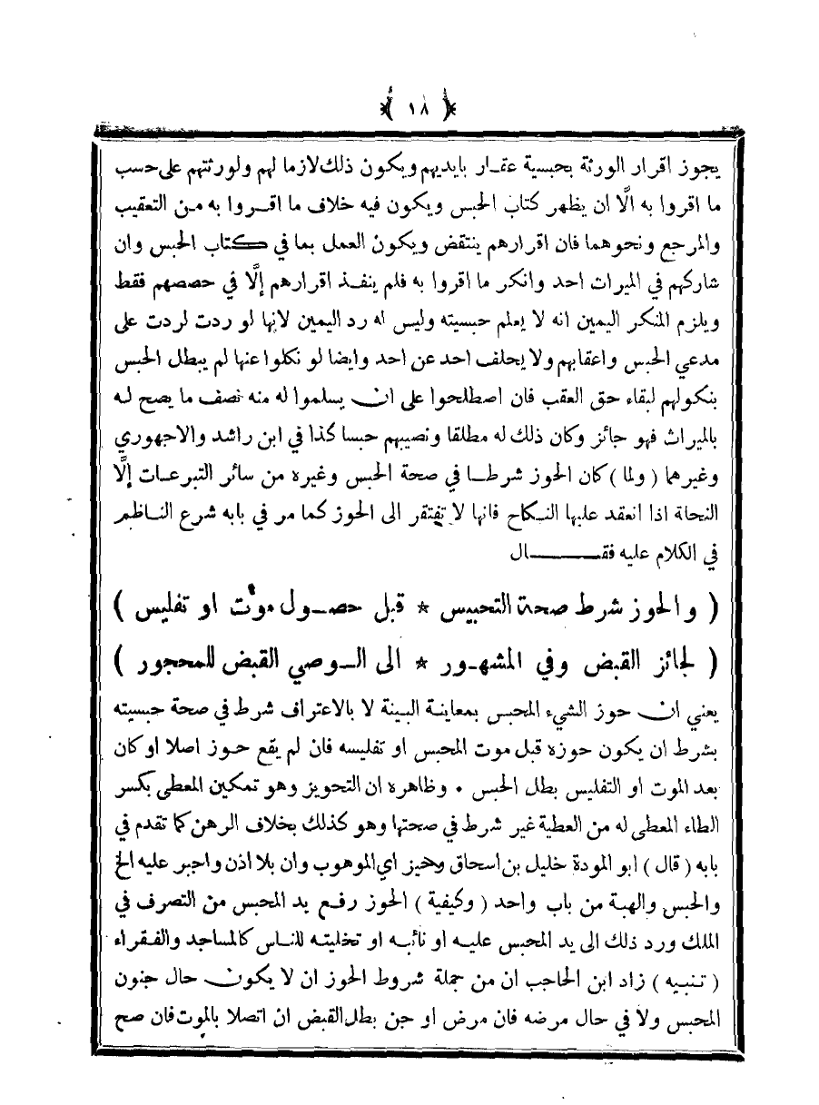 (والحوز شرط صحة التحبيس ... قبل حصول موت أو تفليس)