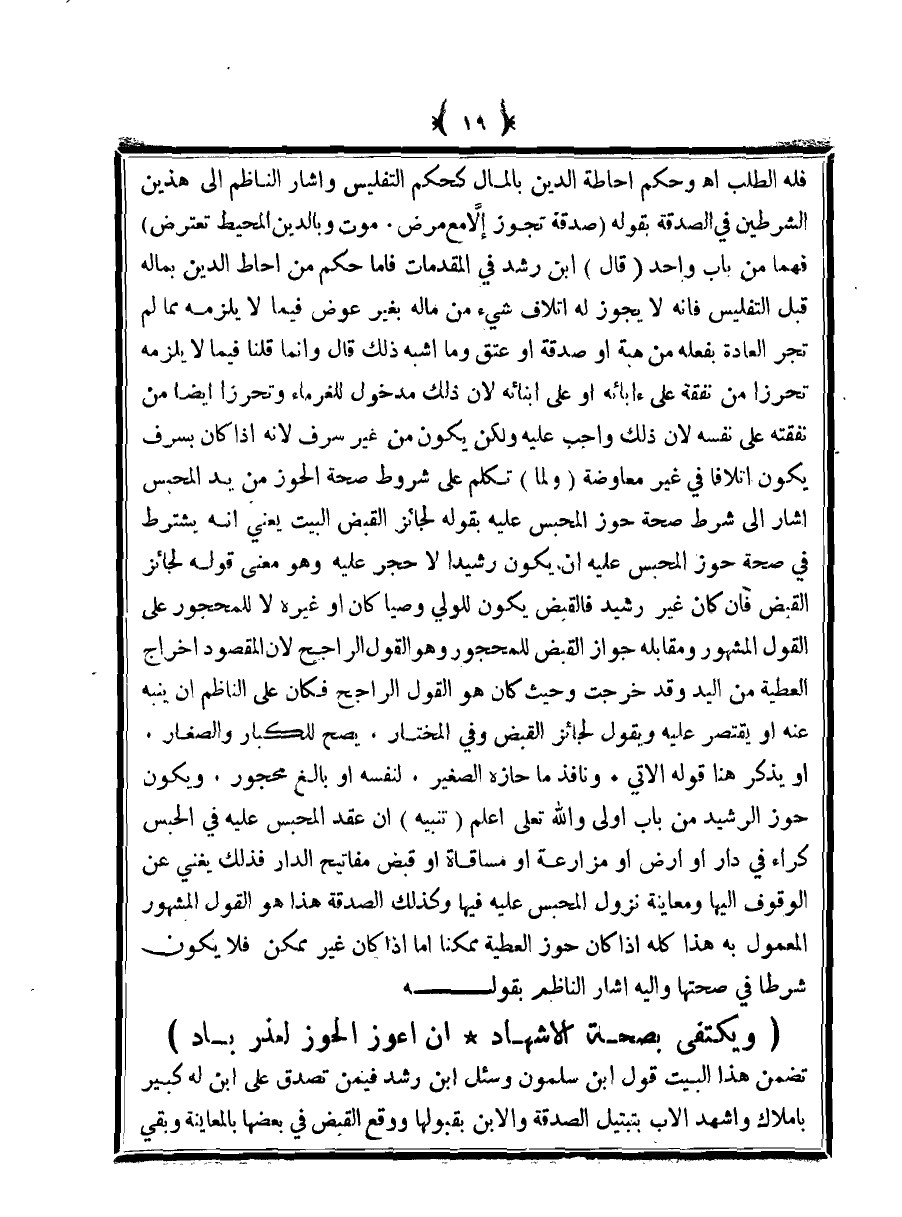 تضمن هذا البيت قول ابن سلمون وسئل ابن رشد فيمن تصدق على ابن له كبير بأملاك وأشهد الأب بتبتيل الصدقة والابن بقبولها ووقع القبض في بعضها بالمعاينة وبقي