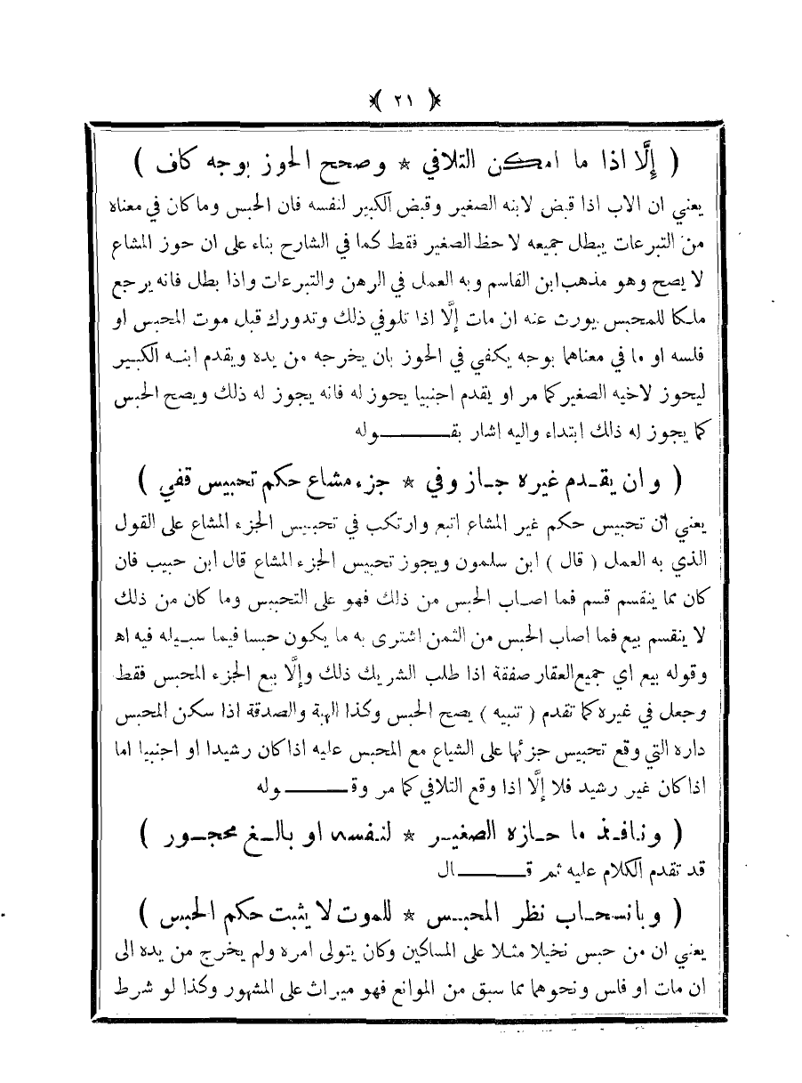 يعني أن تحبيس حكم غير المشاع اتبع وارتكب في تحبيس الجزء المشاع على القول الذي بها لعمل (قال) ابن سلمون ويجوز تحبيس الجزء المشاع قال ابن حبيب فان كان مما ينقسم قسم فما أصاب الحبس من ذلك فهو على التحبيس وما كان من ذلك لا ينقسم بيع فما أصاب الحبس من الثمن اشترى به ما يكون حبسًا فيما سبيله فيه اهـ وقوله بيع أي جميع العقار صفقة إذا طلب الشريك ذلك وإلا بيع الجزء المحبس فقط وجعل في غيره كما تقدم (تنبيه) يصح الحبس وكذا الهبة والصدقة إذا سكن المحبس داره التي وقع تحبيس جزئها على الشياع مع المحبس عليه إذا كان رشيدًا أو أجنبيًا أما إذا كان غير رشيد فلا إلا إذا وقع التلافي كما مر وقوله
