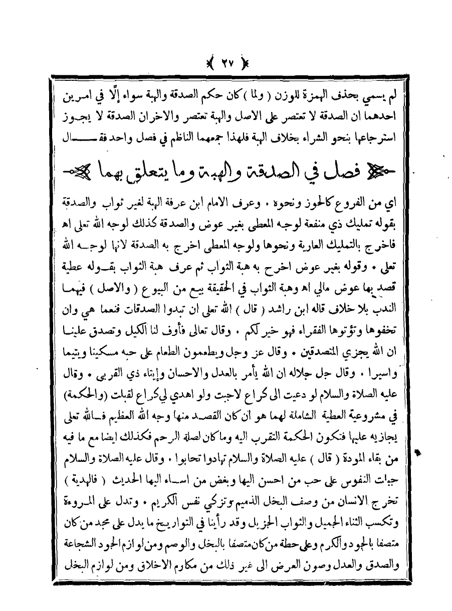 لم يسمي بحذف الهمزة للوزن (ولما) كان حكم الصدقة والهبة سواء إلا في أمرين أحدهما أن الصدقة لا تعتصر على الأصل والهبة تعتصر والأخر أن الصدقة لا يجوز استرجاعها بنحو الشراء بخلاف الهبة فلهذا جمعهما الناظم في فصل واحد فقال