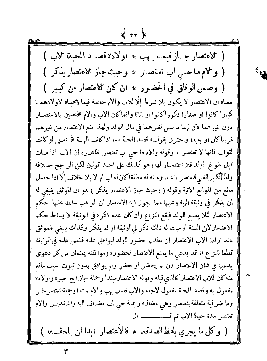 معناه أن الاعتصار لا يكون بلا شرط إلا للأب والأم خاصة فيما وهباه لأولادهما كبارًا كانوا أو صغارًا ذكورًا كانوا أو إناثًا وإنما كان الأب والأم مختصين بالاعتصار دون غيرهما لأن لهما ما ليس لغيرهما في مال الولد ولهذا منع الاعتصار من غيرهما قريبًا كان أو بعيدًا واحترز بقوله قصد المحبة مما إذا كانت الهبة لله تعالى أو كانت لثواب فإنها لا تعتصر. وقوله والأم ما حي أب تعتصر ظاهرة أن الأب إذا مات قبل بلوغ الولد فلا اعتصار لها وهو كذلك على أحد قولين لكن الراجح خلافه وأما الكبير الغني فتعتصر منه ما وهبته له مطلقًا كان له أب أم لا بلا خلاف إلا إذا حصل مانع من الموانع الآتية وقوله (وحيث جاز الاعتصار يذكر) هو أن الموثق ينبغي له أن ينكر في وثيقة الهبة وشبهها مما يجوز فيه الاعتصار أن الواهب سلط عليها حكم الاعتصار لئلا يمتنع الولد فيقع النزاع وإن كان عدم ذكره في الوثيقة لا يسقط حكم الاعتصار لأن السنة أوجبت له ذلك ذكر في الوثيقة أو لم يذكر وكذلك ينبغي للموثق عند إرادة الأب الاعتصار أن يطلب حضور الولد ليوافق عليه فينص عليه في الوثيقة قطعًا للنزاع إذ قد يدعي ما يمنع الاعتصار فحضوره وموافقته يمنعان من كل دعوى يدعيها في شأن الاعتصار فإن لم يحضر أو حضر ولم يوافق بدون ثبوت سبب مانع منه كان للأب الاعتصار كالذي قبله وقوله الاعتصار مبتدأ وجملة جاز الخ خبره وأولاده مفعول به وقصد المحبة مفعول لأجله والأب فاعل يهب والأم مبتدأ وجملة تعتصر خبر وما ضرفية متعلقة بتعتصر وهي مضافة وجملة حي أب مضاف إليه والتقدير والأم تعتصر مدة حياة الأب ثم قال
