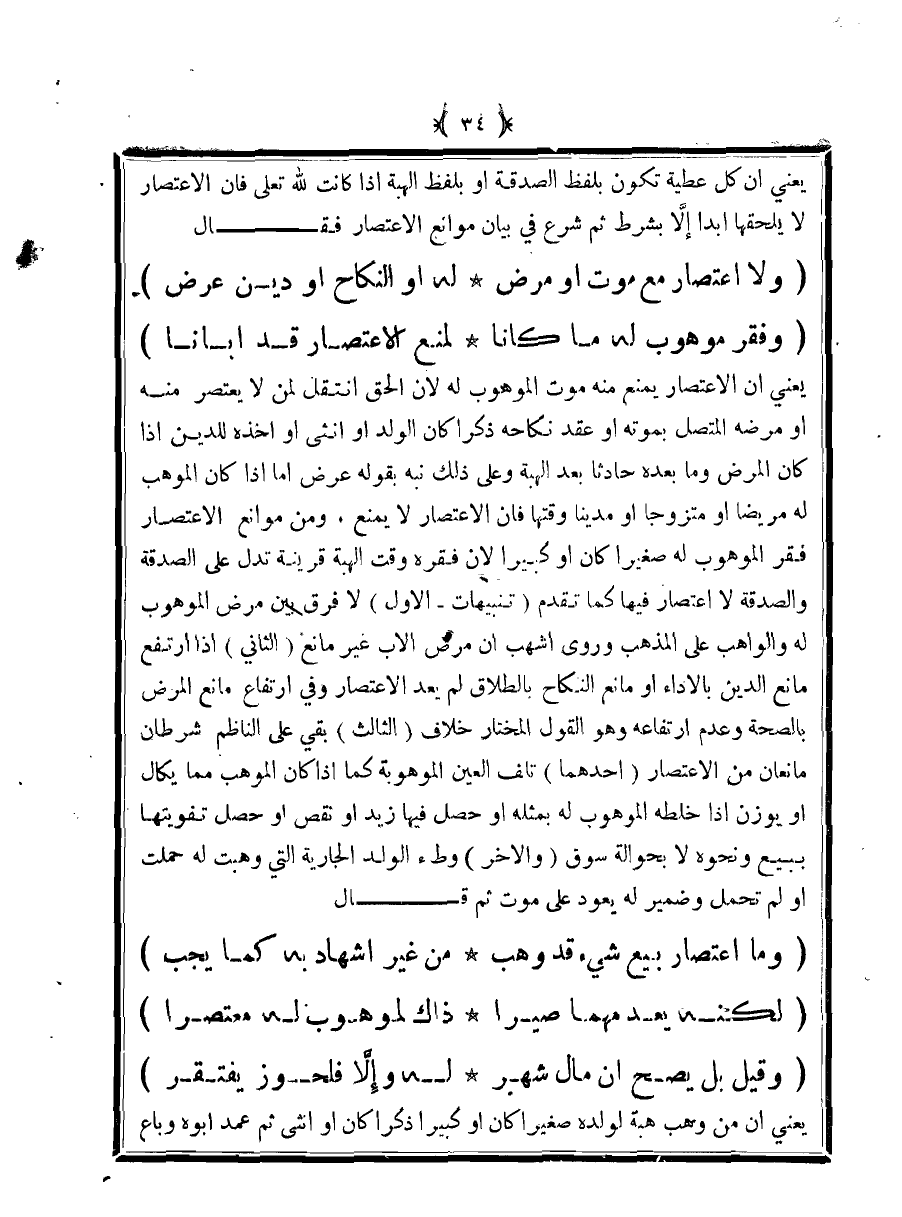 (ولا اعتصار مع موت أو مرض ... له أو النكاح أو دين عرض)