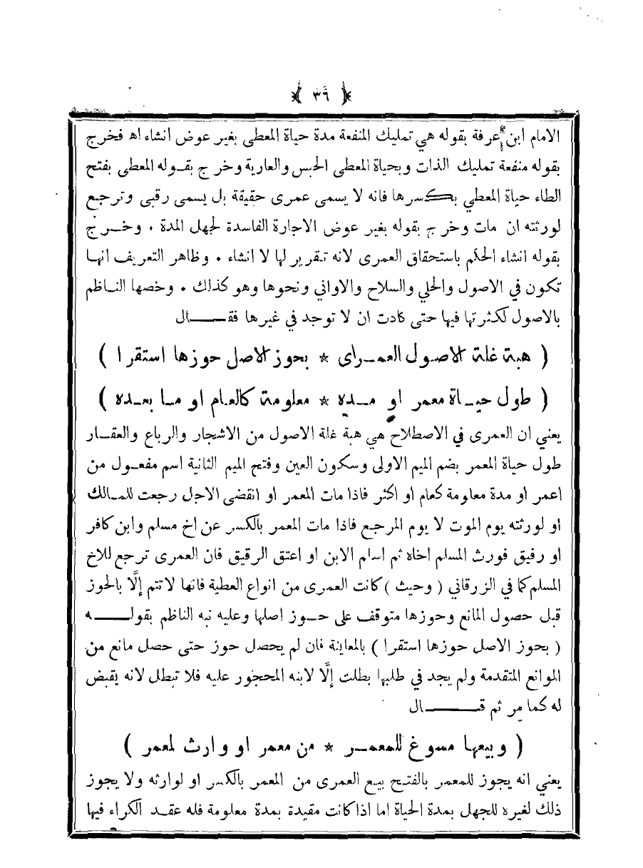 الإمام ابن عرفة بقوله هي تمليك المنفعة مدة حياة المعطى بغير عوض إنشاء اهـ فخرج بقوله منفعة تمليك الذات وبحياة المعطى المحبس والعارية وخرج بقوله المعطى بفتح الطاء حياة المعطي بكسرها فإنه لا يسمى عمرى حقيقة بل يسمى رقبى وترجع لورثته إن مات وخرج بقوله بغير عوض الإجارة الفاسدة لجهل المدة. وخرج بقوله إنشاء الحكم باستحقاق العمرى لأنه تقرير له لا إنشاء. وظاهر التعريف إنها تكون في الأصول والحلي والسلاح والأواني ونحوها وهو كذلك. وخصها الناظم بالأصول لكثرتها فيها حتى كادت أن لا توجد في غيرها فقال