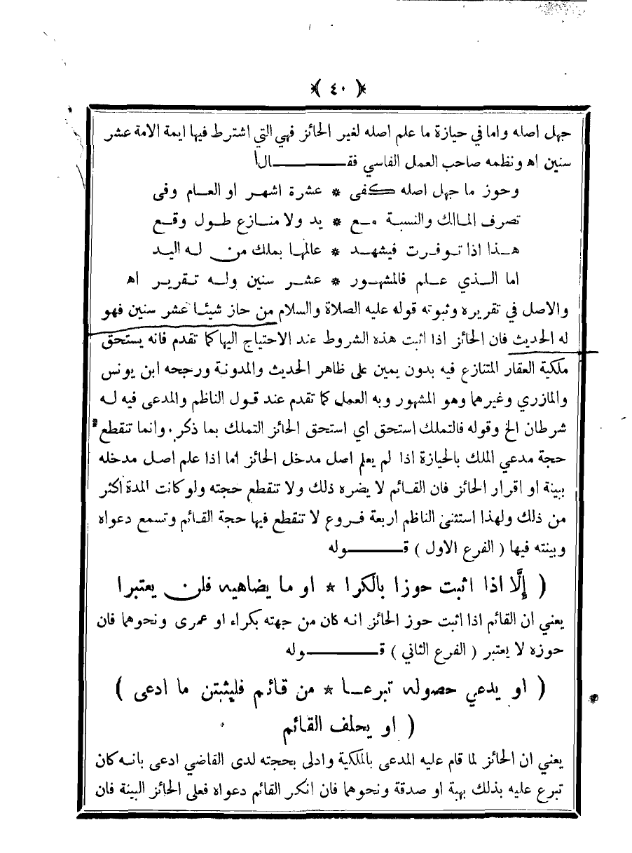 جهل أصله وأما في حيازة ما علم أصله لغير الحائز فهي التي اشترط فيها أيمة الأمة عشر سنين اهـ ونظمه صاحب العمل الفاسي فقال