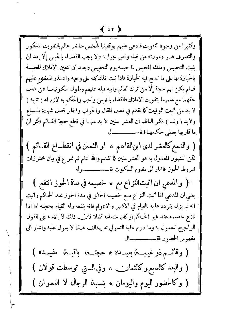 وكثيرًا من وجوه التفويت فادعى عليهم بوقفيتها شخص حاضر عالم بالتفويت المذكور والتصرف هو ومورثه من قبله ونص جوابه ولا يجب القضاء بالحبس إلا بعد أن يثبت التحبيس وملك المحبس لما حبسه يوم التحبيس وبعد أن تتعين الأملاك المحبسة بالحيازة لها على ما تصبح فيه الحيازة فإن ثبت ذلك كله على وجهه وإعذار للمقوم عليهم فلم يكن لهم حجة إلا من ترك القائم وأبيه قبله عليهم وطول سكوتهما عن طلب حقهما مع علمهما بتفويت الأملاك فالقضاء بالحبس واجب والحكم به لازم اهـ (تنبيه) لابد من إثبات الوفيات كما تقدم في فصل المقال والجواب وانظر فصل شهادة السماع ولابد (ولما) ذكر الناظم أن العشر سنين لابد منها في قطع حجة القائم ذكر أن ما قار بها يعطي حكمها فقال