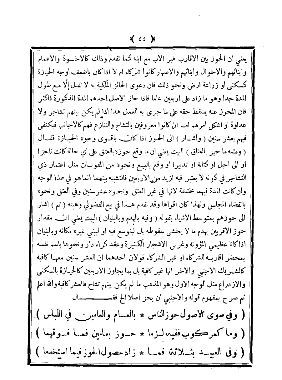 يعني أن الحوز بين الأقارب غير الأب مع ابنه كما تقدم وذلك كالأخوة والأعمام وأبنائهم والأخوال وأبنائهم والأصهار كانوا شركاء أم لا إذا كان بأضعف أوجه الحيازة كسكنى أو زراعة أرض ونحو ذلك فإن دعوى الحائز الملكية به لا تقبل إلا مع طول المدة جدًا وهو ما زاد على أربعين عامًا فإذا حاز الأصل أحدهم المدة المذكورة فأكثر فإن المحوز عنه يسقط حقه على ما جرى به العمل هذا إذا لم يكن بينهم تشاجر ولا عداوة أو أشكل أمرهم أما إن كانوا معروفين بالتشاح والتنازع فهو كالأجانب فيكتفى فيه بعشر سنين (وأشار) إلى الحوز إذا كان بأقوى وجوه الحيازة فقال (ومثله ما حيز بالعتاق) البيت يعني أن ما وقع حوزه بالعتق علي أي حالة كانت ناجزًا أو إلى أجل أو كتابة أو تدبيرًا أو وقع بالبيع ونحوه من المفوتات مثل اعتمار ذي التشاجر في كونه لا يعتبر فيه أزيد من الأربعين فالتشبيه بينهما إنما هو في هذا الوجه وإن كانت المدة فيهما مختلفة لأنها في غير العتق ونحوه عشر سنين وفيه العتق ونحوه بانقضاء المجلس ولهذا كان أقواها وقد تقدم هذا في بيع الفضولي وهبته (ثم) أشار إلى حوزهم بمتوسط الأشياء بقوله (وفيه بالهدم وبالبنيان) البيت يعني أن مقدار حوز الأقربين بهدم ما لا يخشى سقوطه بل ليتوسع فيه أو ليبني غيره مكانه وبالبنيان إذا كان عظيمي المؤونة وغرس الأشجار الكثيرة وعقد كراء دار ونحوها باسم نفسه بمحضر أقاربه الشركاء أو غير الشركاء قولان أحدهما أن العشر سنين معها كافية كالشريك الأجنبي والآخر إنها غير كافية بل بما يجاوز الأربعين كالحيازة بالسكنى والازدراع مثل الوجه الأول وهو المذهب ما لم يكن بينهم تشاح فالعشر كافية والله اعلم ثم صرح بمفهوم قوله والأجنبي أن يحز أصلًا الخ فقال