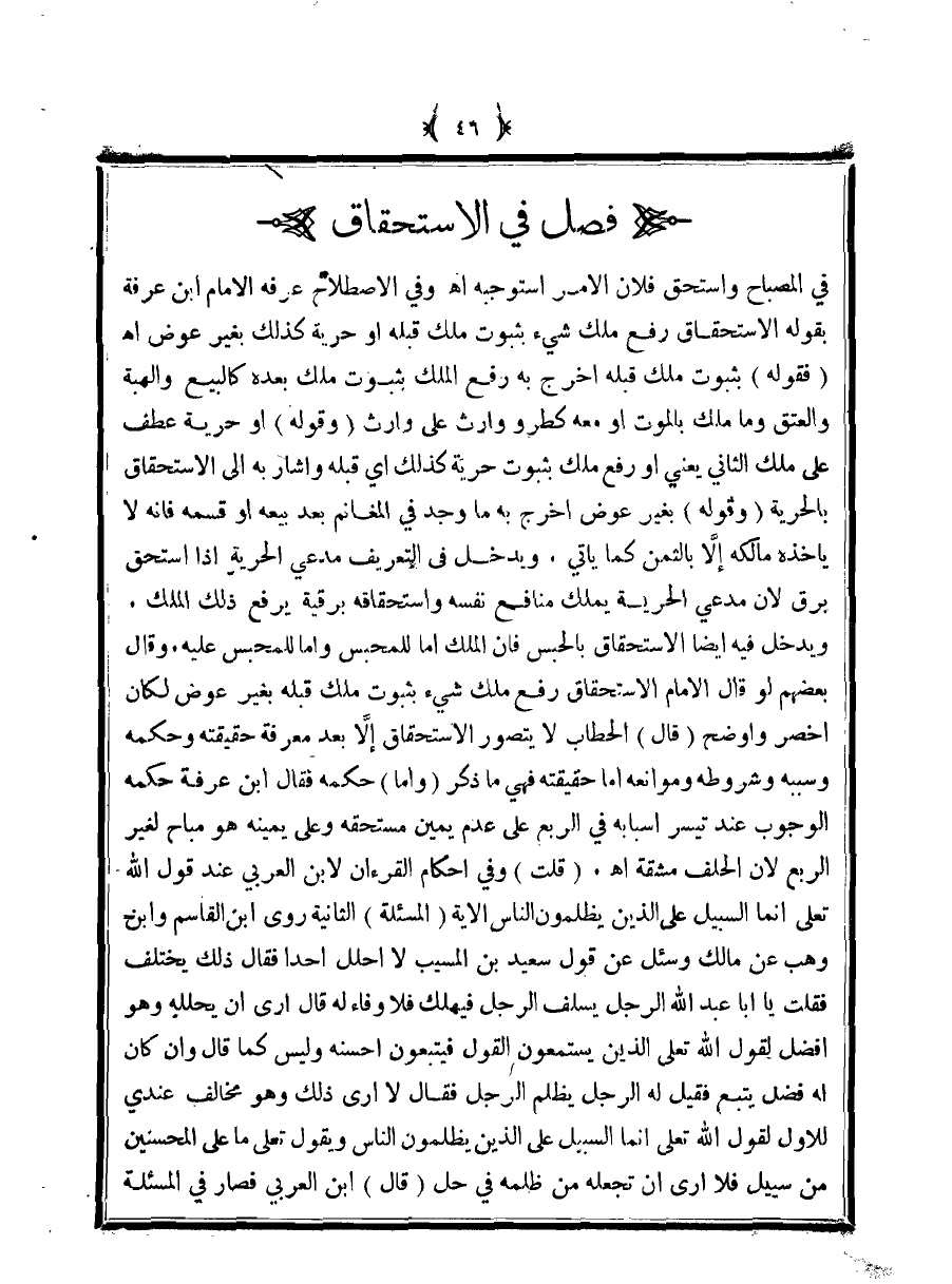 في المصباح واستحق فلان الأمر استوجبه اهـ وفي الاصطلاح عرفه الإمام ابن عرفة بقوله الاستحقاق رفع ملك شيء بثبوت ملك قبله أو حرية كذلك بغير عوض اهـ (فقوله) بثبوت ملك قبله أخرج به رفع الملك بثبوت ملك بعده كالبيع والهبة والعتق وما ملك بالموت أو معه كطرو وارث على وارث (وقوله) أو حرية عطف على ملك الثاني يعني أو رفع ملك بثبوت حرية كذلك أي قبله وأشار به إلى الاستحقاق بالحرية (وقوله) بغير عوض أخرج به ما وجد في المغانم بعد بيعه أو قسمه فإنه لا يأخذه مالكه إلا بالثمن كما يأتي. ويدخل في التعريف مدعي الحرية إذا استحق برق لأن مدعي الحرية يملك منافع نفسه واستحقاقه برقية يرفع ذلك الملك. ويدخل فيه أيضًا الاستحقاق بالحبس فإن الملك إما للمحبس أو للمحبس عليه. وقال بعضهم لو قال الإمام الاستحقاق رفع ملك شيء بثبوت ملك قبله بغير عوض لكان أخصر وأوضح (قال) الحطاب لا يتصور الاستحقاق إلا بعد معرفة حقيقته وحكمه وسببه وشروطه وموانعه أما حقيقته فهي ما ذكر (وأما) حكمه فقال ابن عرفة حكمه الوجوب عند تيسر أسبابه في الربع على عدم يمين مستحقه وعلى يمينه هو مباح لغير الربع لأن الحلف مشقة اهـ. (قلت) وفي أحكام القرءان لابن العربي عند قول الله تعالى إنما السبيل على الذين يظلمون الناس الآية (المسألة) الثانية روى ابن القاسم وابن وهب عن مالك وسئل عن قول سعيد بن المسيب لا أحلل أحدًا فقال ذلك يختلف فقال يا أبا عبد الله الرجل يسلف الرجل فيهلك فلا وفاء له فقال أرى أن يحلله وهو أفضل لقول الله تعالى الذين يستمعون القول فيتبعون أحسنه وليس كما قال وإن كان له فضل يتبع فقيل له الرجل يظلم الرجل فقال لا أرى ذلك وهو مخالف عندي للأول لقول الله تعالى إنما السبيل على الذين يظلمون الناس ويقول تعالى ما على المحسنين من سبيل فلا أرى أن تجعله من ظلمه في حل (قال) ابن العربي فصار في المسألة