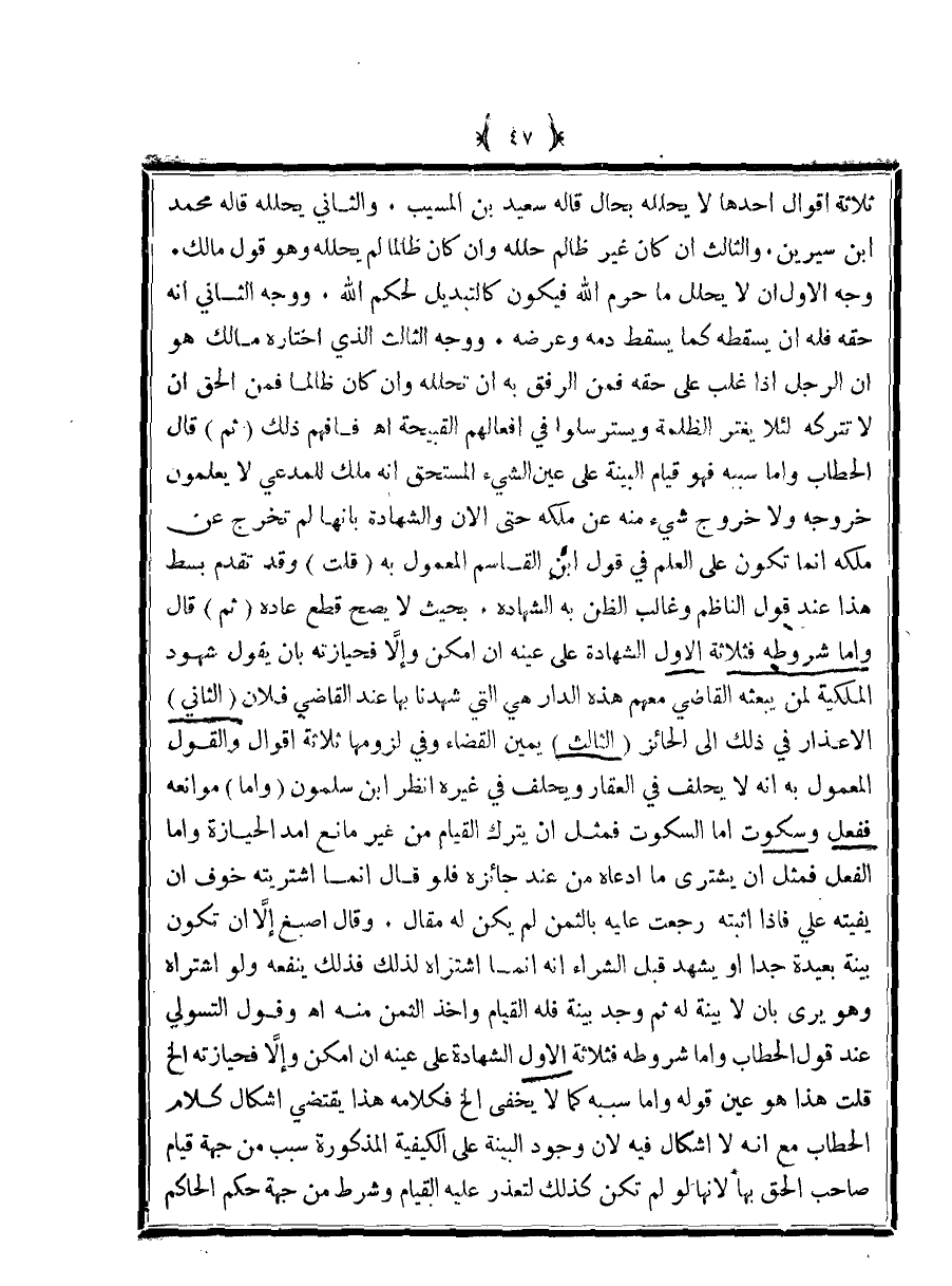ثلاثة أقوال أحدها لا يحلله بحال قاله سعيد بن المسيب. والثاني يحلله قاله محمد ابن سيرين. والثالث إن كان غير ظالم حلله وإن كان ظالمًا لم يحلله وهو قول مالك. وجه الأول أن لا يحلل ما حرم الله فيكون كالتبديل لحكم الله. ووجه الثاني أنه حقه فله أن يسقطه كما سقط دمه وعرضه. ووجه الثالث الذي اختاره مالك هو أن الرجل إذا غلب على حقه فمن الرفق به أن تحلله وإن كان ظالمًا فمن الحق أن لا تتركه لئلا يغتر الظلمة ويسترسلوا في أفعالهم القبيحة اهـ فأفهم ذلك (ثم) قال الحطاب وأما سببه فهو قيام البينة على عين الشيء المستحق أنه ملك للمدعي لا يعلمون خروجه ولا خروج شيء منه عن ملكه حتى الآن والشهادة بأنها لم تخرج عن ملكه إنما تكون على العلم في قول ابن القاسم المعمول به (قلت) وقد تقدم بسط هذا عند قول الناظم وغالب الظن به الشهاده. بحيث لا يصح قطع عادة (ثم) قال وأما شروطه فثلاثة الأول الشهادة على عينه إن أمكن وإلا فحيازته بأن يقول شهود الملكية لمن يبعثه القاضي معهم هذه الدار هي التي شهدنا بها عند القاضي فلان (الثاني) الإعذار في ذلك إلى الحائز (الثالث) يمين القضاء وفي لزومها ثلاثة أقوال والقول المعمول به أنه لا يحلف في العقار ويحلف في غيره انظر ابن سلمون (وأما) موانعه ففعل وسكوت أما السكوت فمثل أن يترك القيام من غير مانع أمد الحيازة وأما الفعل فمثل أن يشتري ما ادعاه من عند جائزه فلو قال إنما اشتريته خوف أن يفتيه علي فإذا أثبته رجعت عليه بالثمن لم يكن له مقال. وقال أصبغ إلا أن تكون بينة بعيدة جدًا أو يشهد قبل الشراء إنه إنما اشتراه لذلك فلذلك ينفعه ولو اشتراه وهو يرى بأن لا بينة له ثم وجد بينة فله القيام وأخذ الثمن منه اهـ وفول التسولي عند قول الحطاب وأما شروطه فثلاثة الأول الشهادة على عينه إن أمكن وإلا فحيازته الخ قلت هذا هو عين قوله وأما سببه كما لا يخفى الخ فكلامه هذا يقتضي إشكال كلام الحطاب مع أنه لا إشكال فيه لأن وجود البينة على الكيفية المذكورة سبب من جهة قيام صاحب الحق بها لأنها لو لم تكن كذلك لتعذر عليه القيام وشرط من جهة حكم الحاكم