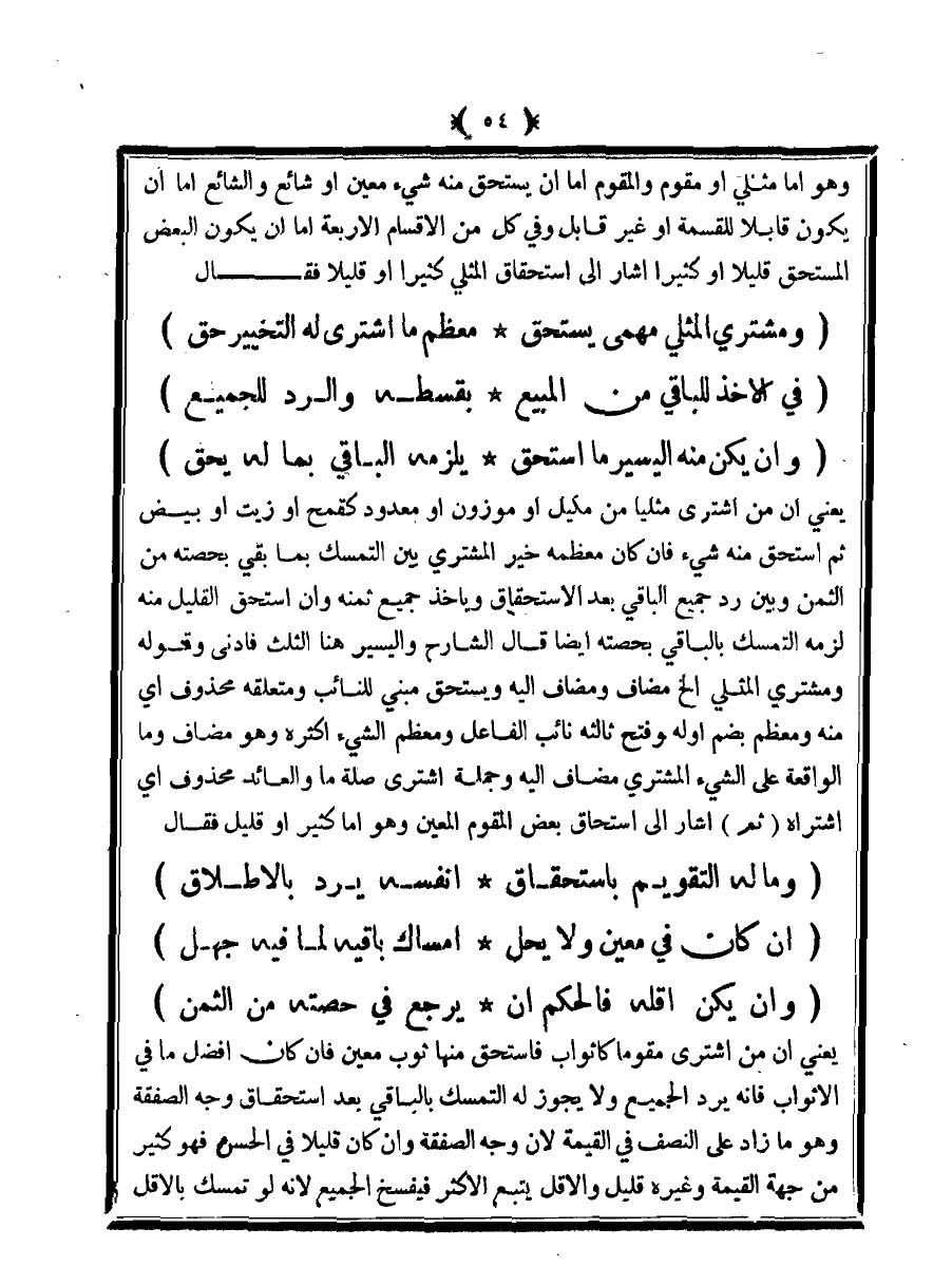 وهو أما مثلي أو مقوم والمقوم إما أن يستحق منه شيء معين أو شائع والشائع إما أن يكون قابلًا للقسمة أو غير قابل وفي كل من الأقسام الأربعة إما أن يكون البعض المستحق قليلًا أو كثيرًا أشار إلى استحقاق المثلي كثيرًا أو قليلًا فقال