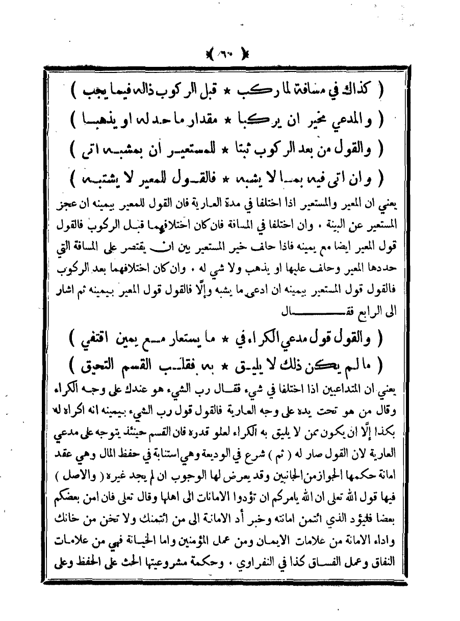 يعني أن المتداعيين إذا اختلفا في شيء فقال رب الشيء هو عندك على وجه الكراء وقال من هو تحت يده على وجه العارية فالقول قول رب الشيء بيمينه إنه اكراه له بكذا إلا أن يكون ممن لا يليق به الكراء لعلو قدره فإن القسم حينئذ يتوجه على مدعي العارية لأن القول صار له (ثم) شرع في الوديعة وهي استنابة في حفظ المال وهي عقد أمانة حكمها الجواز من الجانبين وقد يعرض لها الوجوب إن لم يجد غيره (والأصل) فيها قول الله تعالى إن الله يأمركم أن تؤدوا الأمانات إلى أهلها وقال تعالى فإن آمن بعضكم بعضًا فليؤذ الذي ائتمن أمانته وخبر أد الأمانة إلى من ائتمنك ولا تخن من خانك وأداء الأمانة من علامات الإيمان ومن عمل المؤمنين وأما الخيانة فهي من علامات النفاق وعمل الفساق كذا في النفراوي. وحكمة مشروعيتها الحث على الحفظ وعلى