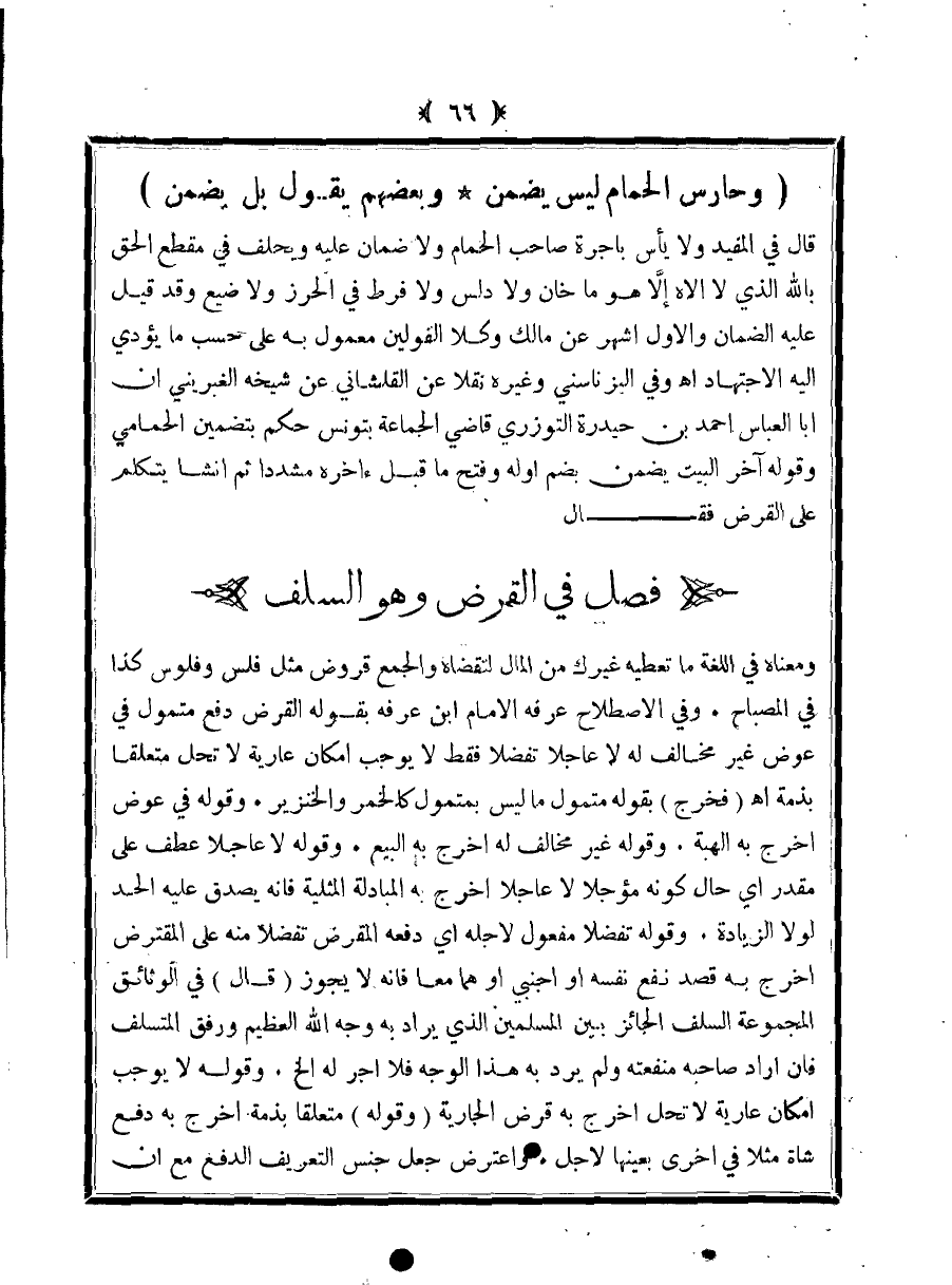 قال في المفيد ولا بأس بأجرة صاحب الحمام ولا ضمان عليه ويحلف في مقطع الحق بالله الذي لا إلاه إلا هو ما خان ولا دلس ولا فرط في الحرز ولا ضيع وقد قيل عليه الضمان والأول أشهر عن مالك وكلا القولين معمول به على حسب ما يؤدي إليه الاجتهاد اهـ وفي البزناسني وغيره نقلا عن القلشاني عن شيخه الغبريني أن أبا العباس أحمد بن حيدرة التوزري قاضي الجماعة بتونس حكم بتضمين الحمامي وقوله آخر البيت يضمن بضم أوله وفتح ما قبل آخره مشددًا ثم أنشأ يتكلم على القرض فقال