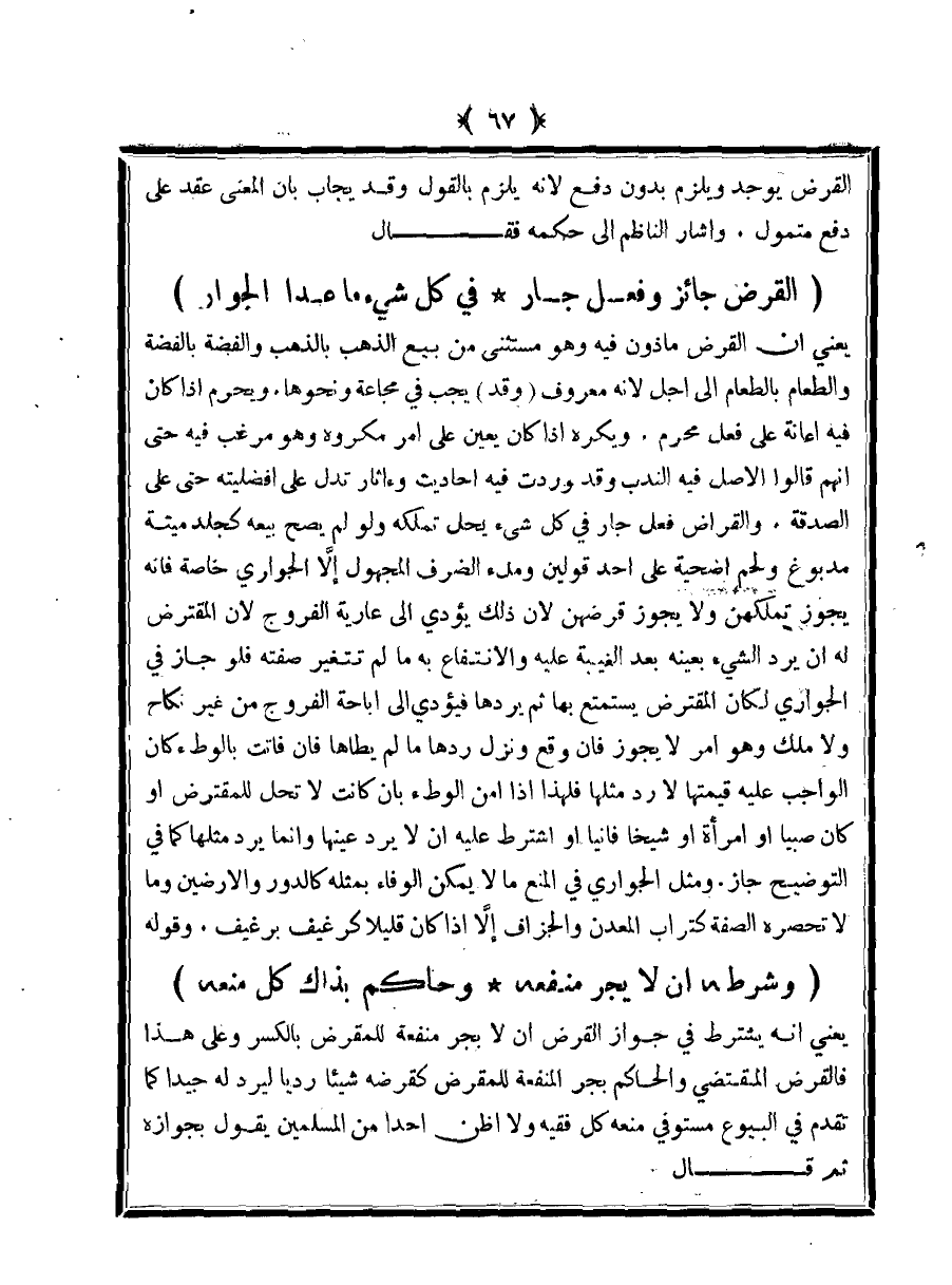 (القرض جائز وفعل جار ... في كل شيء ما عدا الجوار)