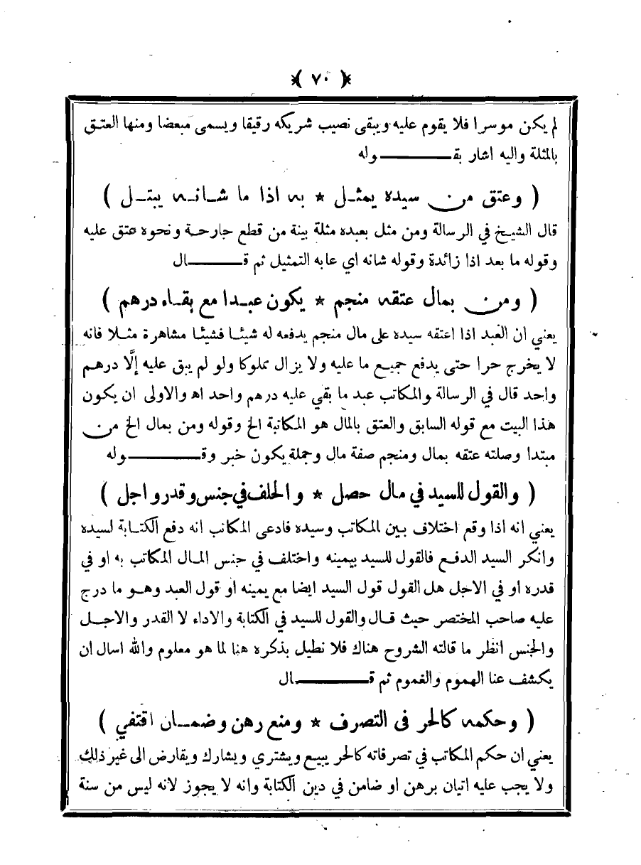 يعني أن العبد إذا اعتقه سيده على مال منجم يدفعه له شيئًا فشيئًا مشاهرة مثلًا فإنه لا يخرج حرًا حتى يدفع جميع ما عليه ولا يزال مملوكًا ولو لم يبق عليه إلا درهم واحد قال في الرسالة والمكاتب عبد ما بقي عليه درهم واحد اهـ والأولى أن يكون هذا البيت مع قوله السابق والعتق بالمال هو المكاتبة الخ وقوله ومن بمال الخ من مبتدأ وصلته عتقه بمال ومنجم صفة مال وجملة يكون خبر وقوله
