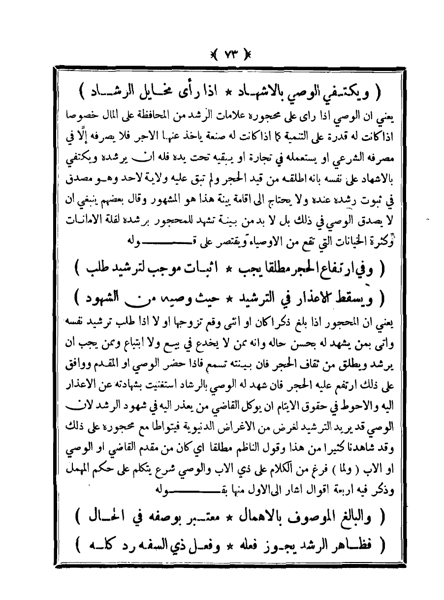 (ويكتفي الوصي بالإشهاد ... إذا رأى مخايل الرشاد)