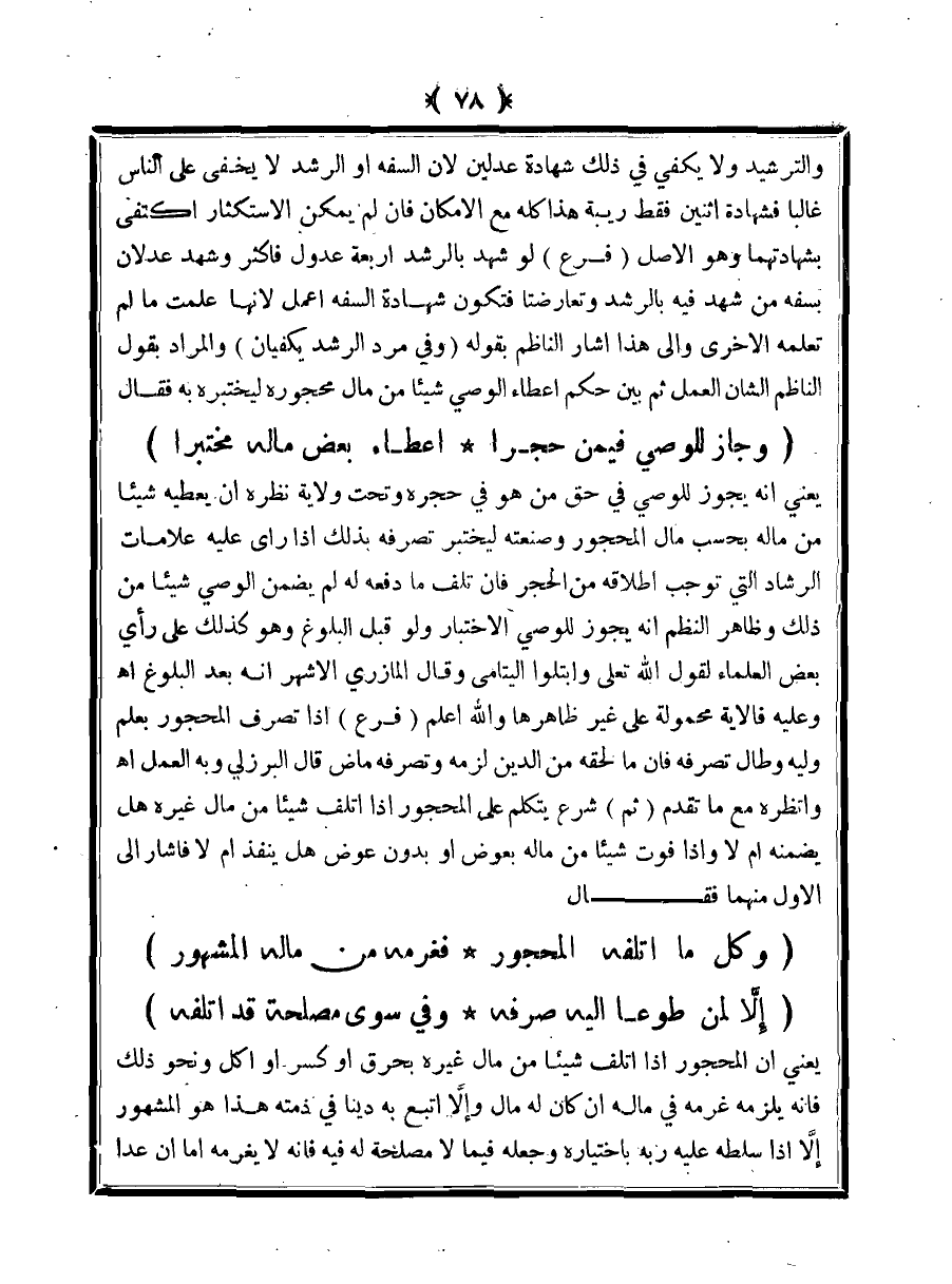 والترشيد ولا يكفي في ذلك شهادة عدلين لأن السفه أو الرشد لا يخفى على الناس غالبًا فشهادة اثنين فقط ريبة هذا كله مع الإمكان فإن لم يمكن الاستكثار اكتفى بشهادتهما وهو الأصل (فرع) لو شهد بالرشد أربعة عدول فأكثر وشهد عدلان بسفيه من شهد فيه بالرشد وتعارضتا فتكون شهادة السفه أعمل لأنها علمت ما لم تعلمه الأخرى وإلى هذا أشار الناظم بقوله (وفي مرد الرشد يكفيان) والمراد بقول الناظم الشأن العمل ثم بين حكم إعطاء الوصي شيئًا من مال محجوره ليختبره به فقال