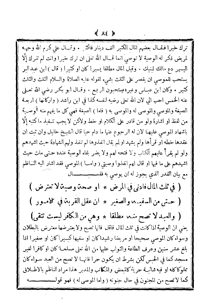 ترك خيرًا فقال بعضهم المال الكثير ألف دينار فأكثر. وقال علي كرم الله وجهه لمريض ذكر له الوصية لا توصي إنما قال الله تعالى أن ترك خيرًا وأنت لم تترك إلا اليسير دع مالك لبنيك. وقيل المال مطلقًا يسيرًا كان أو كثيرًا (قال) ابن عبد البر يستحب للموصي أن يقصر على الثلث بشيء لقوله عليه الصلاة والسلام الثلث والثلث كثير. وكان ابن عباس وغيره يستحبون الربع. وقال أبو بكر رضي الله تعالى عنه الخمس أحب إلي لأن الله تعالى رضيه لنفسه كذا في ابن راشد (وأركانها) أربعة الصيغة ولموصي والموصى له والموصى به (فأما) الصيغة فهي كل ما يفهم منه الوصية من لفظ أو إشارة ولو من قادر على الكلام أو خط ولكن لا يجب تنفيذ ما كتبه إلا بإشهاد الموصي عليها لأن له الرجوع عنها ما دام حيًا قال الشيخ خليل وإن ثبت أن عقدها خطه أو قرأها ولم يشهد أو لم يقل أنفذوها لم تنفذ ولهم الشهادة حيث أشهدهم ولو لم يقرأ عليهم الكتاب ولا فتحه لهم ولا يضر بقاء الوصية عنده حتى مات حيث أشهدهم على ما فيها أو قال لهم أنفذوا وصيتي (وأما) الموصي فقد أشار إليه الناظم مع بيان القدر الذي يجوز له أن يوصي به فقال