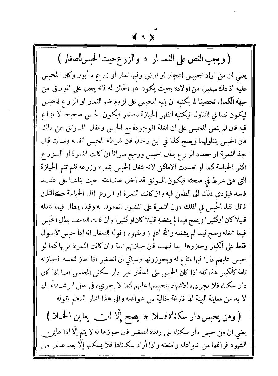 يعني أن من أراد تحبيس أشجار أو أرض وفيها ثمار أو زرع مأبور وكان المحبس عليه إذ ذلك صغيرا من أولاده بحيث يكون هو الحائز له فإنه يجب على الموثق من جهة الكمال تحصينا لما يكتبه أن ينبه المحبس على لزوم ضم الثمار أو الزرع للحبس ليكون نصا في التناول فيكتبه لتظهر الحيازة للصغار فيكون الحبس صحيحا لا نزاع فيه فإن لم ينص المحبس على أن الغلة الموجودة مع الحبس وغفل الموثق عن ذلك فإن الحبس يتناولها ويصح كذا في ابن رحال فإن شرطه المحبس لنفسه ومات قبل جذ الثمرة أو حصاد الزرع بطل الحبس ورجع ميراثا إن كانت الثمرة أو الزرع أكثر الحباسة كما لو تعددت الأماكن لأنه شغل الحبس بثمره وزرعه فلم تتم الحيازة التي هي شرط في صحته فيكون الموثق قد اخل بصناعته حيث بناها على عقد فاسد فيؤدي ذلك إلى الطعن فيه وإن كانت الثمرة أو الزرع أقل الحباسة كالثلث فأقل نفذ الحبس في الملك دون الثمرة على المشهور المعمول به وقيل يبطل فيما شغله قليلا كان أو كثيرا ويصح فيما لم يشغله قليلًا كان أو كثيرًا وإن كانت النصف بطل الحبس فيما شغله وصح فيما لم يشغله والله أعلم (ومفهوم) قوله للصغار أنه إذا حبس الأصول فقط على الكبار وحازوها بما فيها فإن حيازتهم تامة وإن كانت الثمرة لربها كما لو حبس عليهم دارًا فيها متاع له ويحوزونها وسيأتي إن الصغير إذا حاز لنفسه فحيازته تامة كالكبير هذا كله إذا كان الحبس على الصغار غير دار سكنى المحبس أما إذا كان دار سكناه فلا يجزئ الإشهاد عليهم كما لا يجزئ في حق الرشداء بل لابد من معاينة البينة لها فارغة خالية من شواغله وإلى هذا أشار الناظم بقوله