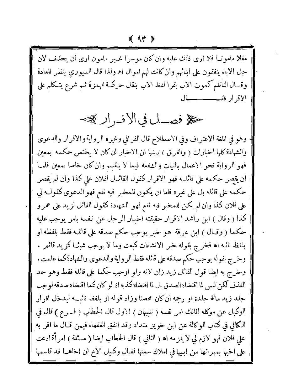 وهو في اللغة الاعتراف وفي الاصطلاح قال القرافي وغيره الرواية والإقرار والدعوى والشهادة كلها إخبارات (والفرق) بينها إن الأخبار لن كان لا يختص حكمه بمعين فهو الرواية نحو الأعمال بالنيات والشفعة فيما لا ينقسم وإن كان خاصًا بمعين فأما أن يقصر حكمه على قائله فهو الإقرار كقول القائل لفلان علي كذا وإن لم يقصر حكمه على قائله بل على غيره فأما أن يكون للمخبر فيه نفع فهو الدعوى كقوله لي على فلان كذا وإن لم يكن للمخبر فيه نفع فهو الشهادة كقول القائل لزيد على عمرو كذا (وقال) ابن راشد الإقرار حقيقته إخبار الرجل عن نفسه بأمر يوجب عليه حكمًا (وقال) ابن عرفة هو خبر يوجب حكم صدقه على قائله فقط بلفظه أو بلفظ نائبه اهـ فخرج بقوله خبر الإنشاءات كبعت وما لا يوجب شيئًا كزيد قائم. وخرج بقوله يوجب حكم صدقه على قائله فقط الرواية والدعوى والشهادة كما علمت. وخرج به أيضًا قول القائل زيد زان لأنه ولو أوجب حكمًا على قائله فقط وهو حد القذف لكن ليس لما اقتضاه الصدق بل لما اقتضاه كذبه إذ لو كان كما اقتضاه صدقه لوجب جلد زيد مائة جلدة أو رجمه إن كان محصنًا وزاد قوله أو بلفظ نائبه ليدخل إقرار الوكيل عن موكله المالك أمر نفسه (تنبيهان) الأول قال الحطاب (فرع) قال في الكافي في كتاب الوكالة عن ابن خويز منداد وقد اتفق الفقهاء فيمن قال ما أقر به علي فلان فهو لازم لي لا يلزمه اهـ (الثاني) قال الحطاب أيضًا (مسألة) امرأة ادعت على أخيها بميراثها من أبيها في أملاك سمتها فقال وكيل الأخ إن أخاها قد قاسمها