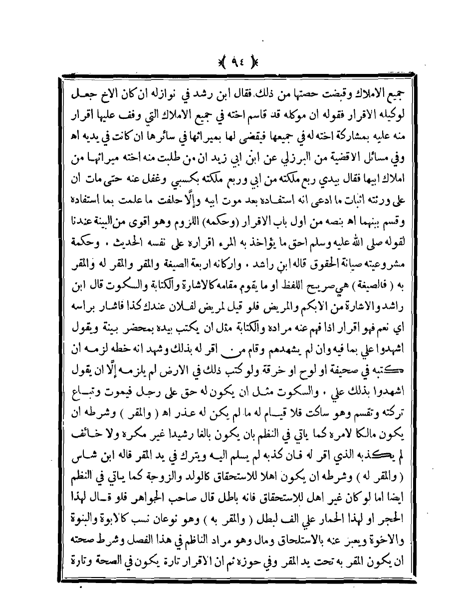 جميع الأملاك وقبضت حصتها من ذلك. فقال ابن رشد في نوازله إن كان الأخ جعل لوكيله الإقرار فقوله إن موكله قد قاسم أخته في جميع الأملاك التي وقف عليها إقرار منه عليه بمشاركة أخته له في جميعها فيقضى لها بميراثها في سائرها إن كانت في يديه اهـ وفي مسائل الأقضية من البرزلي عن ابن أبي زيد أن من طلبت منه أخته ميراثها من أملاك أبيها فقال بيدي ربع ملكته من أبي وربع ملكته بكسبي وغفل عنه حتى مات إن على ورثته إثبات ما ادعى أنه استفاده بعد موت أبيه وإلا حلفت ما علمت بما استفاده وقسم بينهما اهـ بنصه من أول باب الإقرار (وحكمه) اللزوم وهو أقوى من البينة عندنا لقوله صلى الله عليه وسلم أحق ما يؤاخذ به المرء إقراره على نفسه الحديث. وحكمة مشروعيته صيانة الحقوق قاله ابن راشد. وأركانه أربعة الصيغة والمقر والمقر له والمقر به (فالصيغة) هي صريح اللفظ أو ما يقوم مقامه كالإشارة والكتابة والسكوت قال ابن راشد والإشارة من الأبكم والمريض فلو قيل لمريض لفلان عندك كذا فأشار برأسه أي نعم فهو إقرار إذا فهم عنه مراده والكتابة مثل أن يكتب بيده بمحضر بينة ويقول أشهدوا علي بما فيه وإن لم يشهدهم وقام من أقر له بذلك وشهد أنه خطه لزمه أن كتبه في صحيفة أو لوح أو خرقة ولو كتب ذلك في الأرض لم يلزمه إلا أن يقول أشهدوا بذلك علي. والسكوت مثل أن يكون له حق على رجل فيموت وتباع تركته وتقسم وهو ساكت فلا قيام له ما لم يكن له عذر اهـ (والمقر) وشرطه أن يكون مالكًا لأمره كما يأتي في النظم بأن يكون بالغًا رشيدًا غير مكره ولا خائف لم يكذبه الذي أقر له فإن كذبه لم يسلم إليه ويترك في يد المقر قاله ابن شاس (والمقر له) وشرطه أن يكون أهلًا للاستحقاق كالولد والزوجة كما يأتي في النظم أيضًا أما لو كان غير أهل للاستحقاق فإنه باطل قال صاحب الجواهر فلو قال لهذا الحجر أو لهذا الحمار علي ألف لبطل (والمقر به) وهو نوعان نسب كالأبوة والبنوة والأخوة ويعبر عنه بالاستلحاق ومال وهو مراد الناظم في هذا الفصل وشرط صحته أن يكون المقر به تحت يد المقر وفي حوزه ثم إن الإقرار تارة يكون في الصحة وتارة
