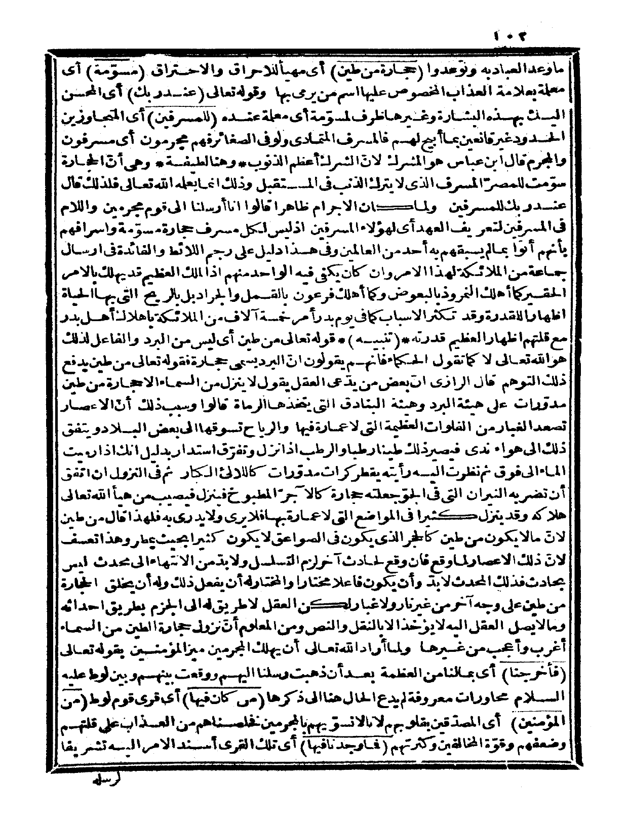 ولما كان الإجرام ظاهراً قالوا {إنا أرسلنا إلى قوم مجرمين} واللام في المسرفين لتعريف العهد أي لهؤلاء المسرفين إذ ليس لكل مسرف حجارة مسوّمة، وإسرافهم بأنهم أتوا بما لم يسبقهم به أحد من العالمين وفي هذا دليل على رجم اللائط، والفائدة في إرسال جماعة من الملائكة لهذا الأمر وإن كان يكفي فيه الواحد منهم إذ الملك العظيم قد يهلك بالأمر الحقير كما أهلك النمروذ بالبعوض، وكما أهلك فرعون بالقمل والجراد بل بالريح التي بها الحياة إظهاراً للقدرة، وقد تكثر الأسباب كما في يوم بدر أمر خمسة آلاف من الملائكة بإهلاك أهل بدر مع قلتهم إظهاراً لعظيم قدرته.