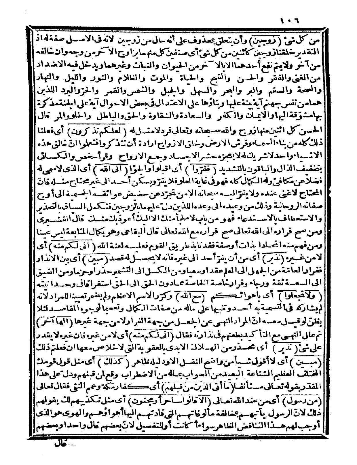 من كل شيء {زوجين} وأن يتعلق بمحذوف على أنه حال من زوجين، لأنه في الأصل صفة له إذ التقدير خلقنا زوجين كائنين من كل شيء، أي صنفين كل منهما يزاوج الآخر من وجه وإن خالفه من آخر ولا يتم نفع أحدهما إلا بالآخر من الحيوان والنبات وغيرهما، ويدخل فيه الأضداد من الغنى والفقر والحسن والقبح والحياة والموت والظلام والنور والليل والنهار والصحة والسقم والبر والبحر والسهل والجبل والشمس والقمر والحر والبرد اللذين هما من نفس جهنم آية بينة عليها وبناؤها على الاعتدال في بعض الأحوال آية على الجنة مذكرة بها مشوّقة إليها، والإيمان والكفر والسعادة والشقاوة والحق والباطل والحلو والمر قال الحسن: كل اثنين منها زوج والله سبحانه وتعالى فرد لا مثل له {لعلكم تذكرون} أي: فعلنا ذلك كله من بناء السماء وفرش الأرض وخلق الأزواج إرادة أن تتذكروا فتعلموا أنّ خالق هذه الأشياء واحد لا شريك له لا يعجزه حشر الأجساد وجمع الأرواح، وقرأ حفص والكسائي بتخفيف الذال والباقون بالتشديد