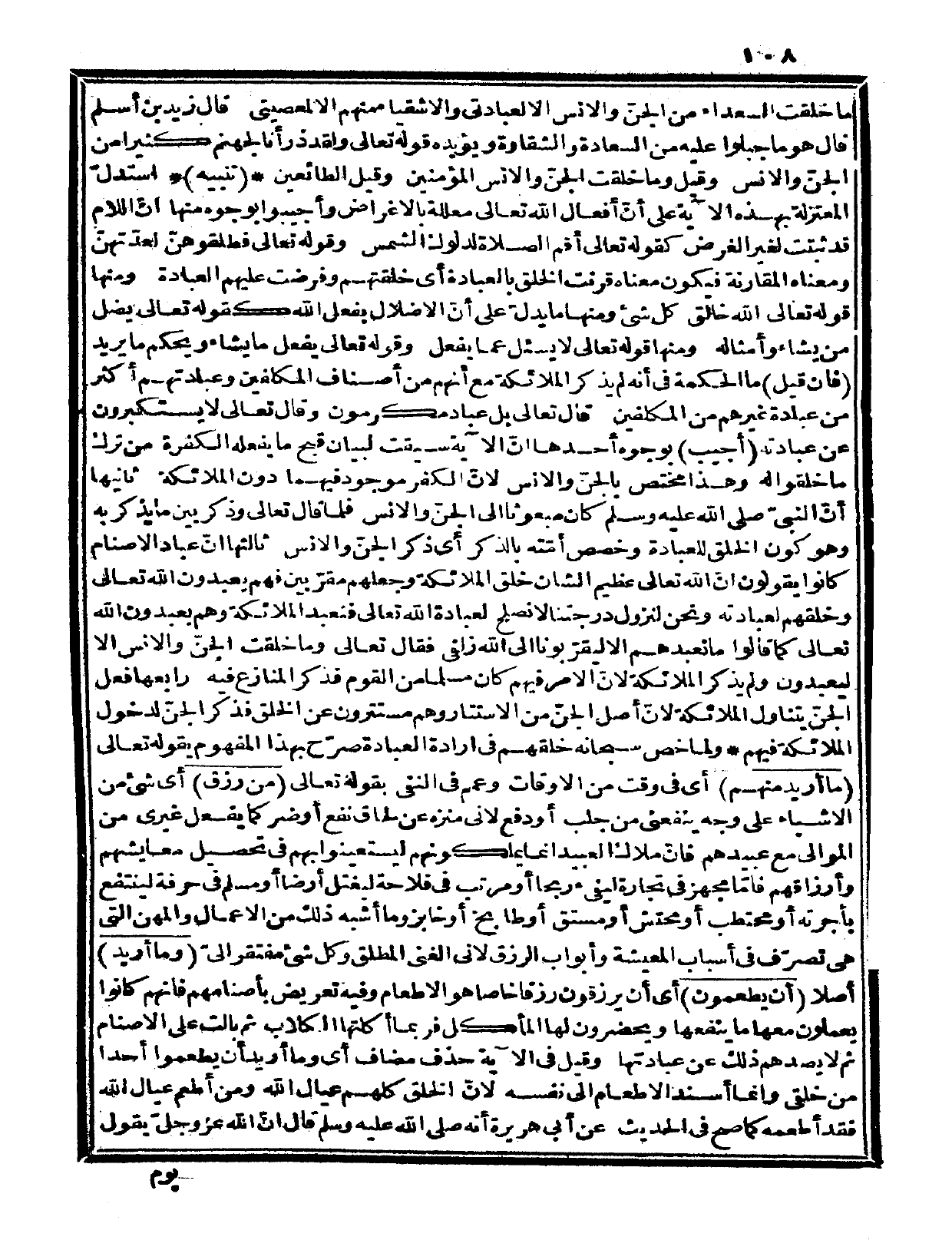 {وما خلقت الجنّ والأنس إلا ليعبدون} ولم يذكر الملائكة لأن الأمر فيهم كان مسلماً من القوم فذكر المنازع فيه. رابعها: فعل الجنّ يتناول الملائكة لأنّ أصل الجنّ من الاستتار وهم مستترون عن الخلق فذكر الجنّ لدخول الملائكة فيهم.