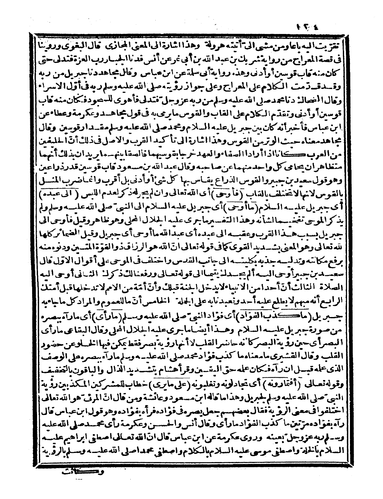 تقرّبت إليه باعاً ومن مشى إليّ أتيته هرولة» وهذا إشارة إلى المعنى المجازي قال البغوي: وروينا في قصة المعراج من رواية شريك بن عبد الله بن أبي نمر عن أنس: فدنا الجبار رب العزة فتدلى حتى كان منه قاب قوسين أو أدنى وهذه رواية أبي سلمة عن ابن عباس وقال مجاهد: دنا جبريل من ربه وقد قدّمت الكلام على المعراج وعلى جواز رؤيته صلى الله عليه وسلم ربه في أوّل الإسراء. وقال الضحاك: دنا محمد صلى الله عليه وسلم من ربه عز وجلّ فتدلى فأهوى للسجود فكان منه قاب قوسين أو أدنى وتقدّم الكلام على القاب، والقوس: ما يرمى به في قول مجاهد وعكرمة وعطاء عن ابن عباس، فأخبر أنه كان بين جبريل عليه السلام ومحمد صلى الله عليه وسلم مقدار قوسين. وقال مجاهد: معناه حيث الوتر من القوس وهذا إشارة إلى تأكيد القرب والأصل في ذلك أنّ الحليفين من العرب كانا إذا أراد الصفاء والعهد خرجا بقوسيهما فالصقا بينهما يريدان بذلك أنهما متظاهران يحامي كل واحد منهما عن صاحبه، وقال عبد الله بن مسعود: قاب قوسين قدر ذراعين وهو قول سعيد بن جبير، والقوس الذراع يقاس بها كل شيء أو أدنى بل أقرب وإنما ضرب المثل بالقوس لأنها لا تختلف بالقاب.