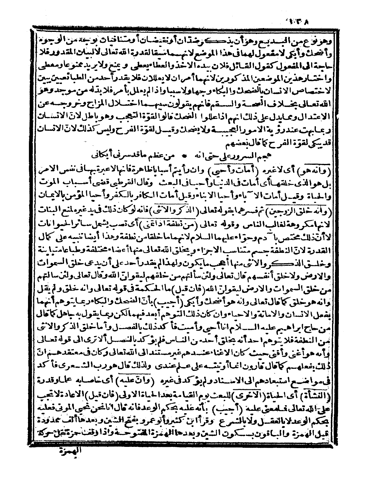 وهو نوع من البديع، وهو: أن يذكر ضدّان أو نقيضان أو متنافيان بوجه من الوجوه، وأضحك وأبكى لا مفعول لهما في هذا الموضع لأنهما سيقا لقدرة الله تعالى لا لبيان المقدور فلا حاجة إلى المفعول كقول القائل: فلان بيده الأخذ والعطاء يعطي ويمنع، ولا يريد ممنوعاً ومعطى واختار هذين الموضعين المذكورين لأنهما أمران لا يعللان فلا يقدر أحد من الطبائعيين يبين لاختصاص الإنسان بالضحك والبكاء وجهاً ولا سبباً، وإذا لم يعلل بأمر فلا بدّ له من موجد وهو الله تعالى بخلاف الصحة والسقم فإنهم يقولون: سببهما اختلال المزاج وخروجه عن الاعتدال ومما يدل على ذلك أنهم إذا عللوا الضحك قالوا: لقوّة التعجب وهو باطل، لأنّ الإنسان ربما بهت عند رؤية الأمور العجيبة ولا يضحك وقيل: لقوّة الفرح وليس كذلك لأنّ الإنسان قد يبكي لقوّة الفرح كما قال بعضهم: