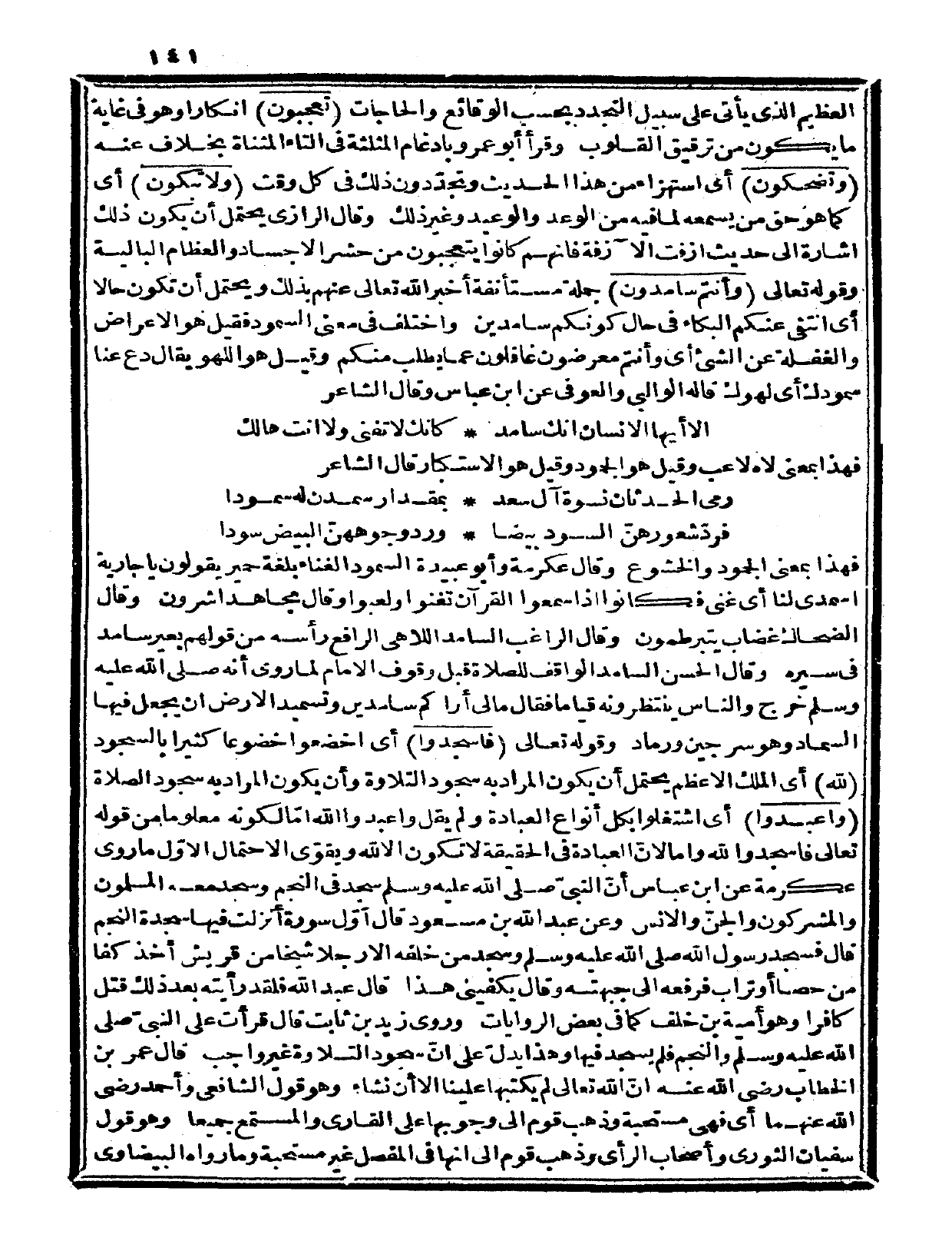 فهذا بمعنى الجمود والخشوع وقال عكرمة وأبو عبيدة: السمود الغناء بلغة حمير يقولون: يا جارية اسمدي لنا أي: غني، فكانوا إذا سمعوا القرآن تغنوا ولعبوا وقال مجاهد أشِرون وقال الضحاك: غضاب يتبرطمون وقال الراغب: السامد اللاهي الرافع رأسه من قولهم بعير سامد في سيره وقال الحسن: السامد الواقف للصلاة قبل وقوف الإمام لما روي: أنه صلى الله عليه وسلم خرج والناس ينتظرونه قياماً فقال: «مالي أراكم سامدين» وتسميد الأرض أن يجعل فيها السماد وهو سرجين ورماد وقوله تعالى: {فاسجدوا} أي: اخضعوا خضوعاً كثيراً بالسجود {لله} أي الملك الأعظم يحتمل أن يكون المراد به سجود التلاوة وأن يكون المراد به سجود الصلاة {واعبدوا} أي: اشتغلوا بكل أنواع العبادة ولم يقل واعبدوا الله إما لكونه معلوماً من قوله تعالى: {فاسجدوا لله} وإما لأنّ العبادة في الحقيقة لا تكون إلا لله ويقوّى الاحتمال الأوّل ما روى عكرمة عن ابن عباس أنّ النبيّ صلى الله عليه وسلم «سجد في النجم وسجد معه المسلمون والمشركون والجنّ والإنس» وعن عبد الله ابن مسعود قال أوّل سورة أنزلت فيها سجدة النجم قال: فسجد رسول الله صلى الله عليه وسلم وسجد من خلفه إلا رجلاً شيخاً من قريش أخذ كفاً من حصا أو تراب فرفعه إلى جبهته وقال: يكفيني هذا، قال عبد الله: فلقد رأيته بعد ذلك قتل كافراً وهو أمية بن خلف كما في بعض الروايات. وروى زيد بن ثابت قال: قرأت على النبيّ صلى الله عليه وسلم {والنجم} فلم يسجد فيها وهذا يدلّ على أنّ سجود التلاوة غير واجب، قال عمر بن الخطاب رضي الله عنه إنّ الله تعالى لم يكتبها علينا إلا أن نشاء وهو قول الشافعي وأحمد رضي الله عنهما، أي: فهي مستحبة وذهب قوم إلى وجوبها على القارئ والمستمع جميعاً وهو قول سفيان الثوري وأصحاب الرأي وذهب قوم إلى أنها في المفصل غير مستحبة. وما رواه البيضاوي