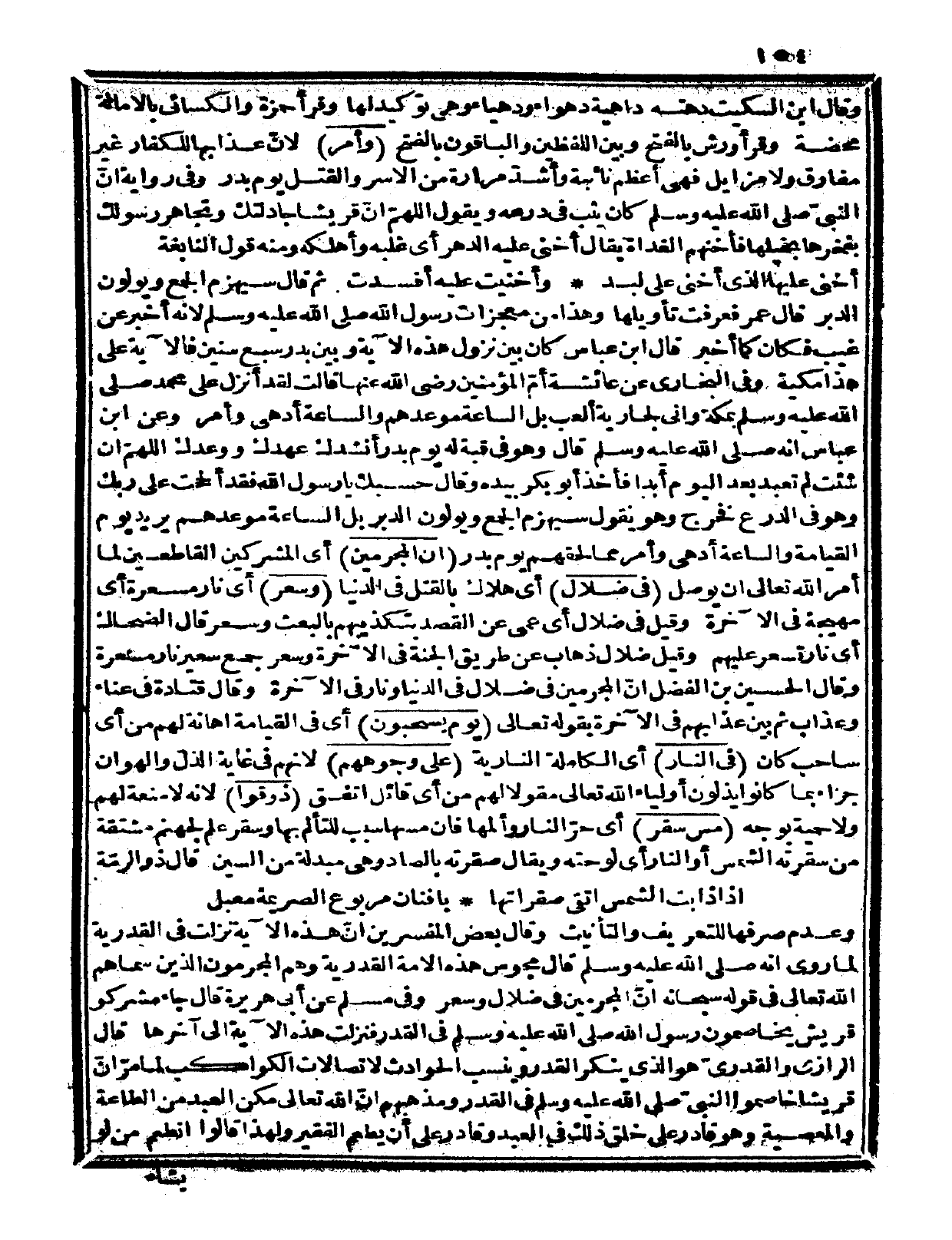 وعدم صرفها للتعريف والتأنيث. وقال بعض المفسرين: إنّ هذه الآية نزلت في القدرية لما روي أنه صلى الله عليه وسلم قال: «مجوس هذه الأمة القدرية» وهم المجرمون الذين سماهم الله تعالى في قوله سبحانه {إنّ المجرمين في ضلال وسعر} وفي مسلم عن أبي هريرة قال: «جاء مشركو قريش يخاصمون رسول الله صلى الله عليه وسلم في القدر فنزلت هذه الآية إلى آخرها» قال الرازي: والقدري هو الذي ينكر القدر وينسب الحوادث لاتصالات الكواكب لما مرّ أنّ قريشاً خاصموا النبيّ صلى الله عليه وسلم في القدر، ومذهبهم أن الله تعالى مكن العبد من الطاعة والمعصية وهو قادر على خلق ذلك في العبد وقادر على أن يطعم الفقير ولهذا قالوا: أنطعم من لو
