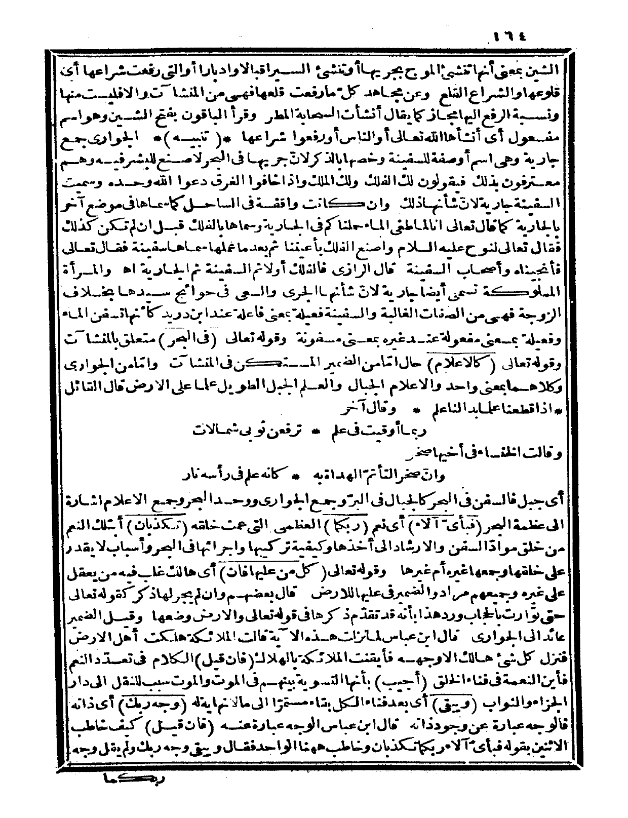 والسفينة فعليه بمعنى فاعله عند ابن دريد؛ كأنها تسفن الماء وفعيلة بمعنى مفعولة عند غيره بمعنى مسفونة وقوله تعالى: {في البحر} متعلق بالمنشآت وقوله تعالى: {كالأعلام} حال إمّا من الضمير المستكن في المنشآت وإمّا من الجواري وكلاهما بمعنى واحد؛ والأعلام الجبال والعلم الجبل الطويل علماً على الأرض قال القائل: