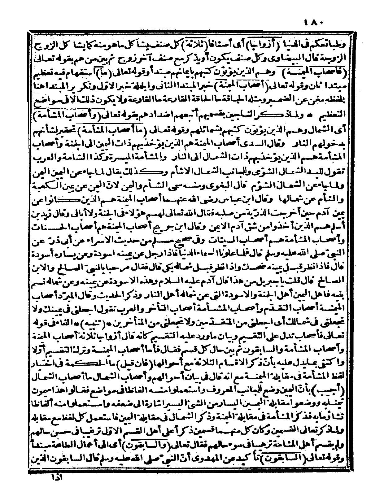 وفي صحيح مسلم من حديث الإسراء عن أبي ذر عن النبيّ صلى الله عليه وسلم قال: «فلما علونا السماء الدنيا فإذا رجل عن يمينه أسودة وعن يساره أسودة قال: فإذا نظر قبل يمينه ضحك، وإذا نظر قبل شماله بكى قال: فقال: مرحباً بالنبيّ الصالح والابن الصالح، قال: قلت: يا جبريل من هذا؟ قال: آدم عليه السلام وهذه الأسودة عن يمينه وعن شماله نسم بنيه، فأهل اليمين أهل الجنة، والأسودة التي عن شماله أهل النار» . وذكر الحديث وقال المبرّد: أصحاب الميمنة: أصحاب التقدّم وأصحاب المشأمة: أصحاب التأخر والعرب تقول اجعلني في يمينك ولا تجعلني في شمالك، أي: اجعلني من المتقدّمين، ولا تجعلني من المتأخرين.