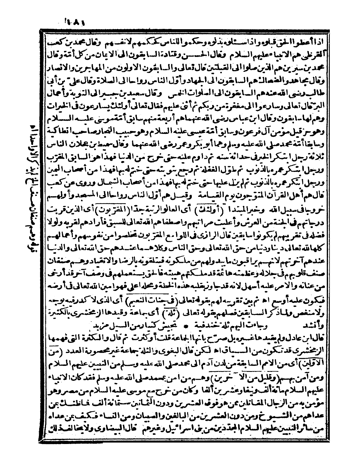 إذا أعطوا الحق قبلوه، وإذا سُئِلوه بذلوه وحكموا للناس كحكمهم لأنفسهم» . وقال محمد بن كعب القرظي: هم الأنبياء عليهم السلام، وقال الحسن وقتادة: السابقون إلى الإيمان من كل أمّة؛ وقال محمد بن سيرين: هم الذين صلوا إلى القبلتين قال تعالى: {والسابقون الأولون من المهاجرين والأنصار} (التوبة: 100)