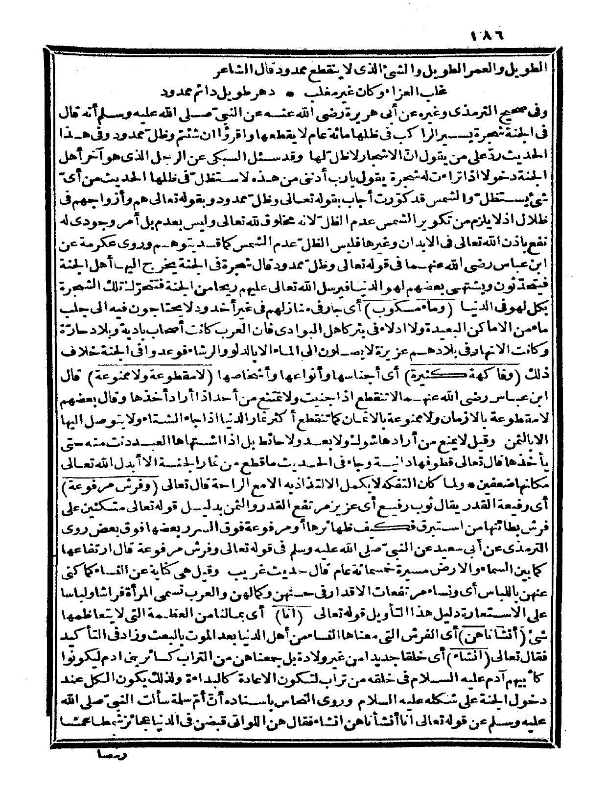 وفي صحيح الترمذي وغيره، عن أبي هريرة رضى الله عنه: عن النبيّ صلى الله عليه وسلم أنه قال: «في الجنة شجرة يسير الراكب في ظلها مئة عام لا يقطعها، واقرؤوا إن شئتم {وظلّ ممدود} » في هذا الحديث ردّ على من يقول: إنّ الأشجار لا ظل لها وقد سئل السبكي عن الرجل الذي هو آخر أهل الجنة دخولاً إذا تراءت له شجرة يقول: يا رب أدنني من هذه لأستظل في ظلها، الحديث من أيّ شيء يستظل والشمس قد كورت؟ أجاب بقوله تعالى: {وظلّ ممدود} وبقوله تعالى: {هم وأزواجهم في ظلال} (يس: 56)