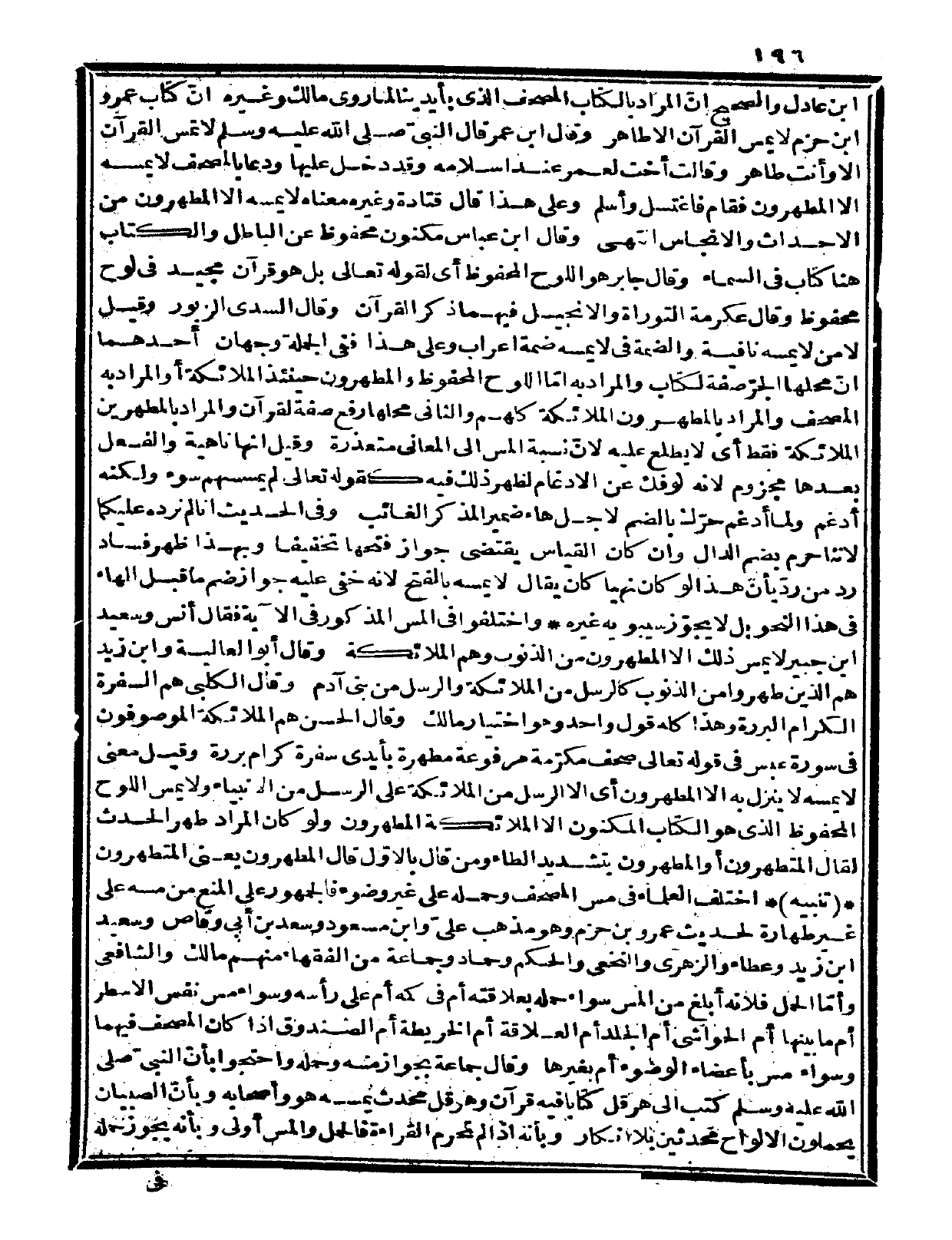 ابن عادل: والصحيح أنّ المراد بالكتاب: المصحف الذي بأيدينا لما روى مالك وغيره أن كتاب عمرو بن حزم «لا يمس القرآن إلا طاهر» ، وقال ابن عمر قال النبيّ صلى الله عليه وسلم «لا تمس القرآن إلا وأنت طاهر» وقالت أخت عمر لعمر عند إسلامه وقد دخل عليها ودعا بالمصحف {لا يمسه إلا المطهرون} فقام فاغتسل وأسلم، وعلى هذا قال قتادة وغيره معناه لا يمسه إلا المطهرون من الأحداث والأنجاس انتهى.