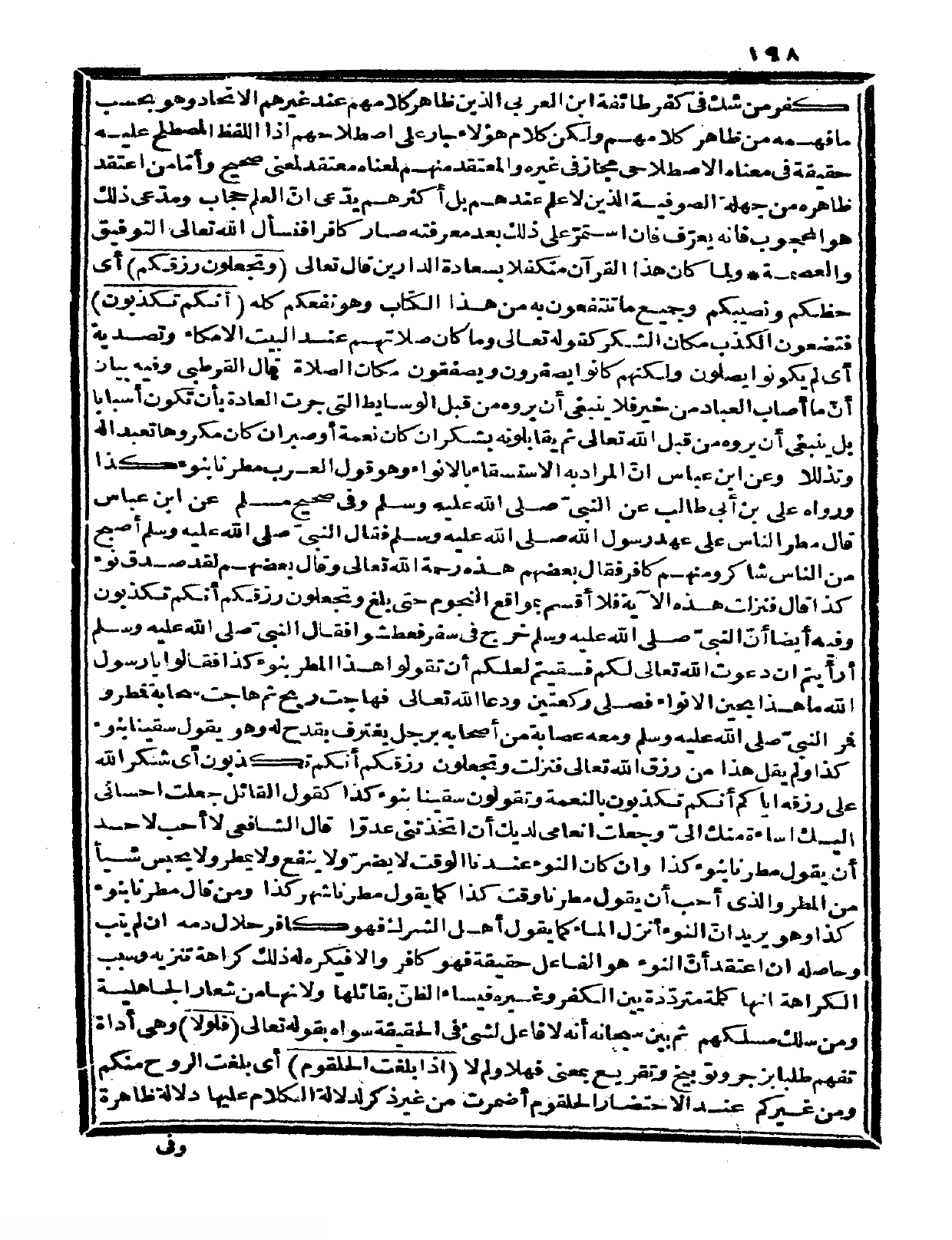 وفيه أيضاً «أنّ النبيّ صلى الله عليه وسلم خرج في سفر فعطشوا فقال النبيّ صلى الله عليه وسلم أرأيتم إن دعوت الله تعالى لكم فسقيتم لعلكم أن تقولوا هذا المطر بنوء كذا فقالوا: يا رسول الله ما هذا بحين الأنواء فصلى ركعتين ودعا الله تعالى، فهاجت ريح ثم هاجت سحابة فمطروا، فمر النبيّ صلى الله عليه وسلم ومعه عصابة من أصحابه برجل يغترف بقدح له وهو يقول سقينا بنوء كذا ولم يقل هذا من رزق الله تعالى فنزلت {وتجعلون رزقكم أنكم تكذبون} » . أي: شكراً الله على رزقه إياكم أنكم تكذبون بالنعمة، وتقولون: سقينا بنوء كذا كقول القائل: جعلت إحساني إليك إساءة منك إليّ وجعلت إنعامي لديك أن اتخذتني عدوّاً، قال الشافعي: لا أحب لأحد أن يقول مطرنا بنوء كذا وإن كان النوء عندنا الوقت لا يضرّ ولا ينفع ولا يمطر ولا يحبس شيئاً من المطر، والذي أحب أن يقول: مطرنا وقت كذا كما يقول مطرنا شهر كذا، ومن قال مطرنا بنوء كذا وهو يريد أن النوء أنزل الماء كما يقول أهل الشرك فهو كافر حلال دمه إن لم يتب. وحاصله إن اعتقد أنّ النوء هو الفاعل حقيقة فهو كافر وإلا فيكره له ذلك كراهة تنزيه، وسبب الكراهة: أنها كلمة مترددة بين الكفر وغيره فيساء الظنّ بقائلها ولأنها من شعار الجاهلية ومن سلك مسلكهم