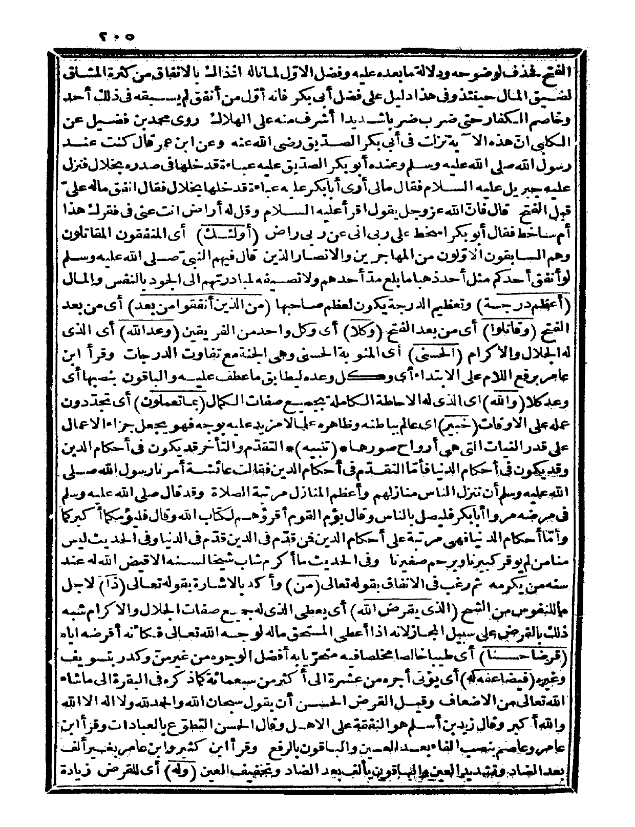 الفتح، فحذف لوضوحه ودلالة ما بعده عليه، وفضل الأوّل لما ناله إذ ذاك بالإنفاق من كثرة المشاق لضيق المال حينئذ، وفي هذا دليل على فضل أبي بكر فإنه أوّل من أنفق لم يسبقه في ذلك أحد، وخاصم الكفار حتى ضرب ضرباً شديداً أشرف منه على الهلاك، روى محمد بن فضيل عن الكلبي: أنّ هذه الآية نزلت في أبي بكر الصديق رضى الله عنه، وعن ابن عمر قال: «كنت عند رسول الله صلى الله عليه وسلم وعنده أبو بكر الصديق عليه عباءة قد خلها في صدره بخلال فنزل عليه جبريل عليه السلام فقال: مالي أرى أبا بكر عليه عباءة قد خلها بخلال؟ فقال: أنفق ماله عليّ قبل الفتح قال: فإنّ الله عز وجل يقول: اقرأ عليه السلام وقل له: أراض أنت عني في فقرك هذا أم ساخط؟ فقال أبو بكر: أسخط على ربي إني عن ربي راض» {أولئك} أي: المنفقون المقاتلون وهم السابقون الأوّلون من المهاجرين والأنصار الذين قال فيهم النبيّ صلى الله عليه وسلم «لو أنفق أحدكم مثل أحد ذهباً ما بلع مدّ أحدهم ولا نصيفه» لمبادرتهم إلى الجود بالنفس والمال {أعظم درجة} وتعظيم الدرجة يكون لعظم صاحبها {من الذين أنفقوا من بعد} أي: من بعد الفتح {وقاتلوا} أي: من بعد الفتح {وكلا} أي: وكل واحد من الفريقين {وعد الله} أي: الذي له