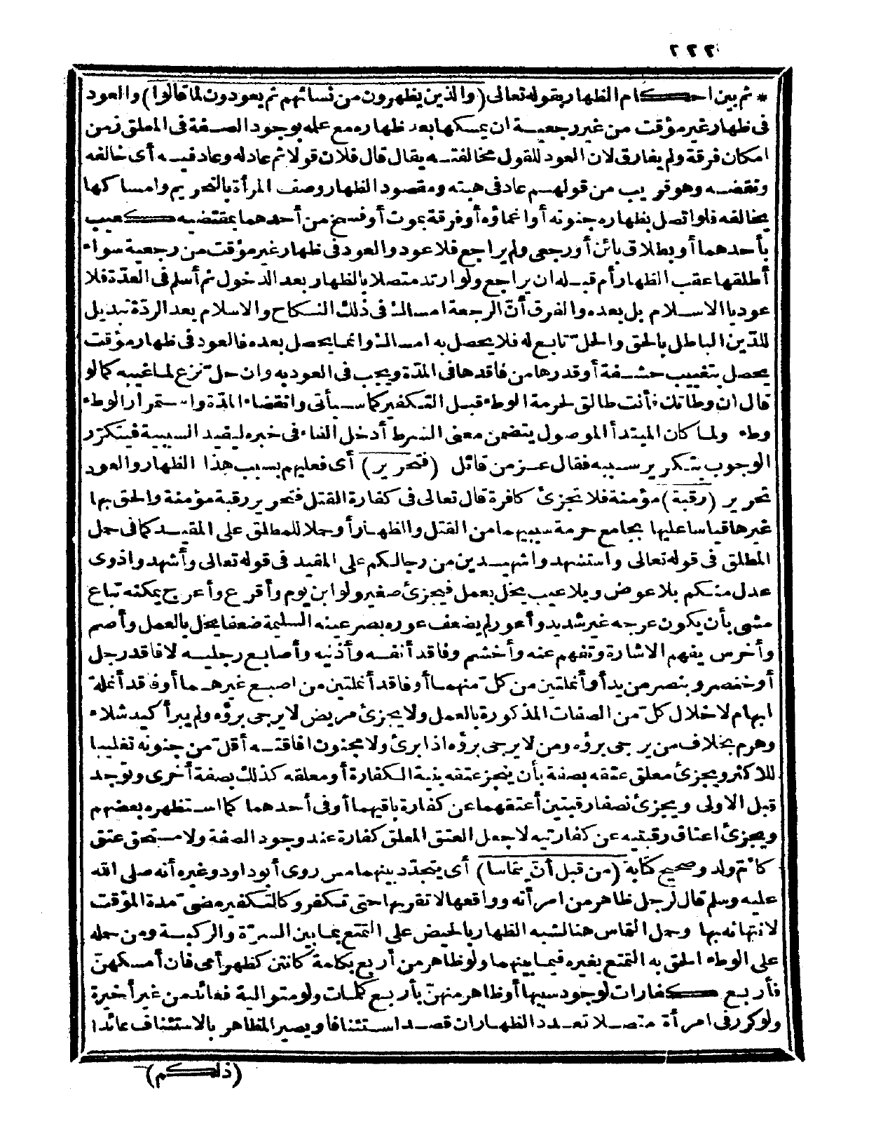 ولو ارتد متصلاً بالظهار بعد الدخول ثم أسلم في العدّة فلا عود بالإسلام بل بعده، والفرق أنّ الرجعة إمساك في ذلك النكاح والإسلام بعد الردّة تبديل للدّين الباطل بالحق والحّل تابع له فلا يحصل به إمساك وإنما يحصل بعده فالعود في ظهار مؤقت يحصل بتغييب حشفة أو قدرها من فاقدها في المدّة ويجب في العود به وإن حلّ نزع لما غيبه، كما لو قال: إن وطأتك فأنت طالق لحرمة الوطء قبل التكفير كما سيأتي وانقضاء المدة واستمرار الوطء وطء ولما كان المبتدأ الموصول يتضمن معنى الشرط أدخل الفاء في خبره ليفيد السببية فيتكرّر الوجوب بتكرير سببه فقال عز من قائل: {فتحرير} أي: فعليهم بسبب هذا الظهار والعود تحرير {رقبة} مؤمنة فلا تجزىء كافرة قال تعالى في كفارة القتل: {فتحرير رقبة مؤمنة} (النساء: 92)