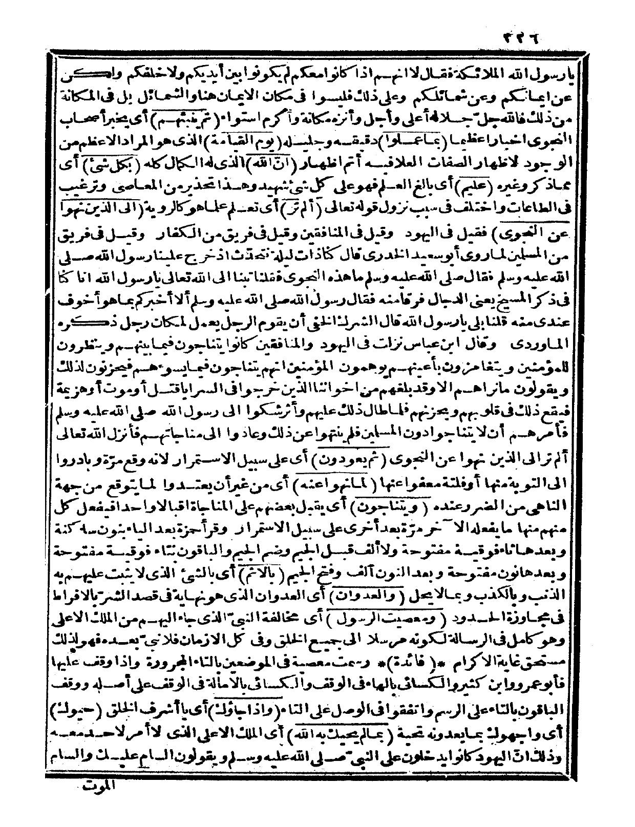 وقال ابن عباس: «نزلت في اليهود والمنافقين، كانوا يتناجون فيما بينهم وينظرون للمؤمنين ويتغامزون بأعينهم يوهمون المؤمنين أنهم يتناجون فيما يسوءهم فيحزنون لذلك ويقولون: ما نراهم إلا وقد بلغهم من إخواننا الذين خرجوا وفي السرايا قتل أو موت أو هزيمة، فيقع ذلك في قلوبهم ويحزنهم، فلما طال ذلك عليهم وأثر شكوا إلى رسول الله صلى الله عليه وسلم فأمرهم أن لا يتناجوا دون المسلمين فلم ينتهوا عن ذلك وعادوا إلى مناجاتهم فأنزل الله تعالى: {ألم تر إلى الذين نهوا عن النجوى} {ثم يعودون} أي: على سبيل الاستمرار، لأنه وقع مرّة وبادروا إلى التوبة منها أو فلتة معفواً عنها {لما نهوا عنه} أي: من غير أن يعتدوا لما يتوقع من جهة الناهي من الضرر عنده {ويتناجون} أي: يقبل بعضهم على المناجاة إقبالاً واحداً فيفعل كل منهم منها ما يفعله الآخر مرّة بعد أخرى على سبيل الاستمرار.