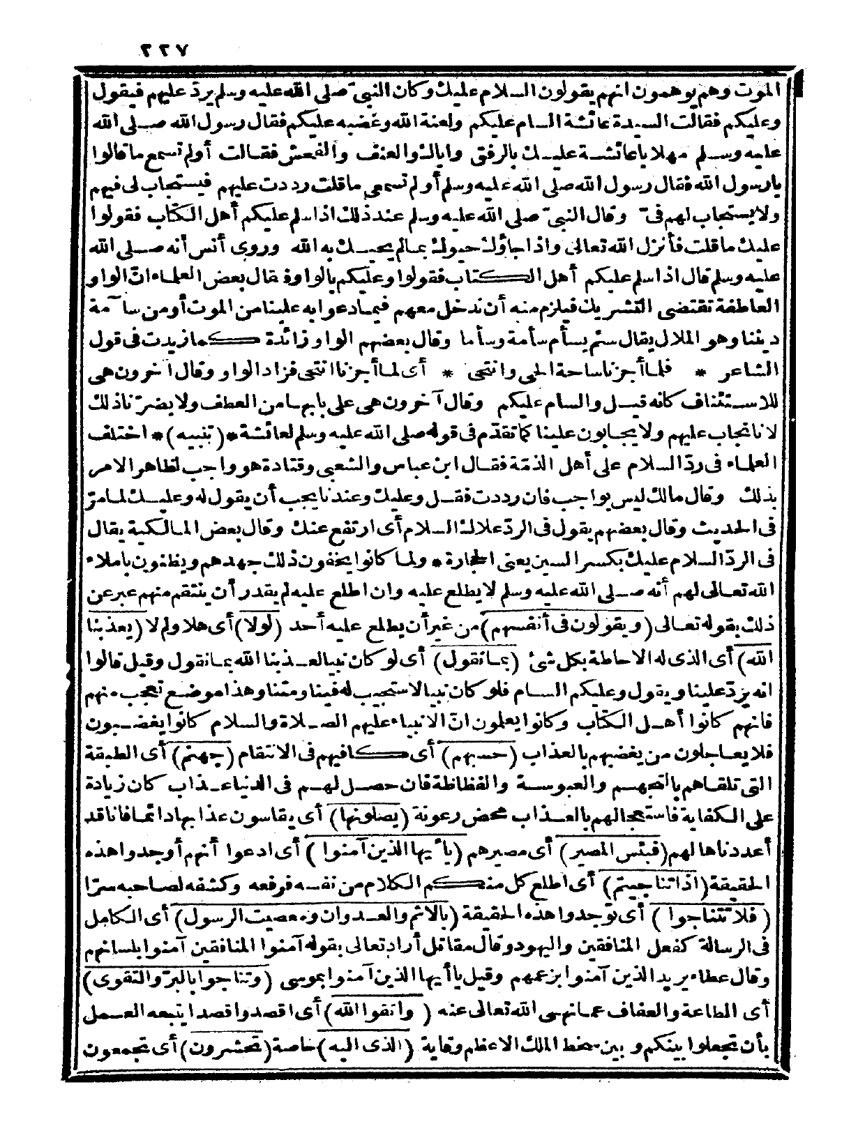 الموت وهم يوهمون أنهم يقولون السلام عليك وكان النبيّ صلى الله عليه وسلم يرد عليهم فيقول: وعليكم فقالت السيدة عائشة: السام عليكم ولعنة الله وغضبه عليكم، فقال رسول الله صلى الله عليه وسلم مهلاً يا عائشة عليك بالرفق وإياك والعنف والفحش، فقالت: أو لم تسمع ما قالوا يا رسول الله؟ فقال رسول الله صلى الله عليه وسلم أو لم تسمعي ما قلت، رددت عليهم فيستجاب لي فيهم ولا يستجاب لهم فيّ» وقال النبي صلى الله عليه وسلم عند ذلك: «إذا سلم عليكم أهل الكتاب فقولوا: عليك ما قلت» فأنزل الله تعالى: {وإذا جاؤوك حيوك بما لم يحيك به الله} وروى أنس أنه صلى الله عليه وسلم قال: «إذا سلم عليكم أهل الكتاب فقولوا وعليكم» بالواو فقال بعض العلماء: إنّ الواو العاطفة تقتضي التشريك فيلزم منه أن ندخل معهم فيما دعوا به علينا من الموت أو من سآمة ديننا وهو الملال يقال سئم يسأم سأمة وسأماً، وقال بعضهم: الواو زائدة كما زيدت في قول الشاعر: