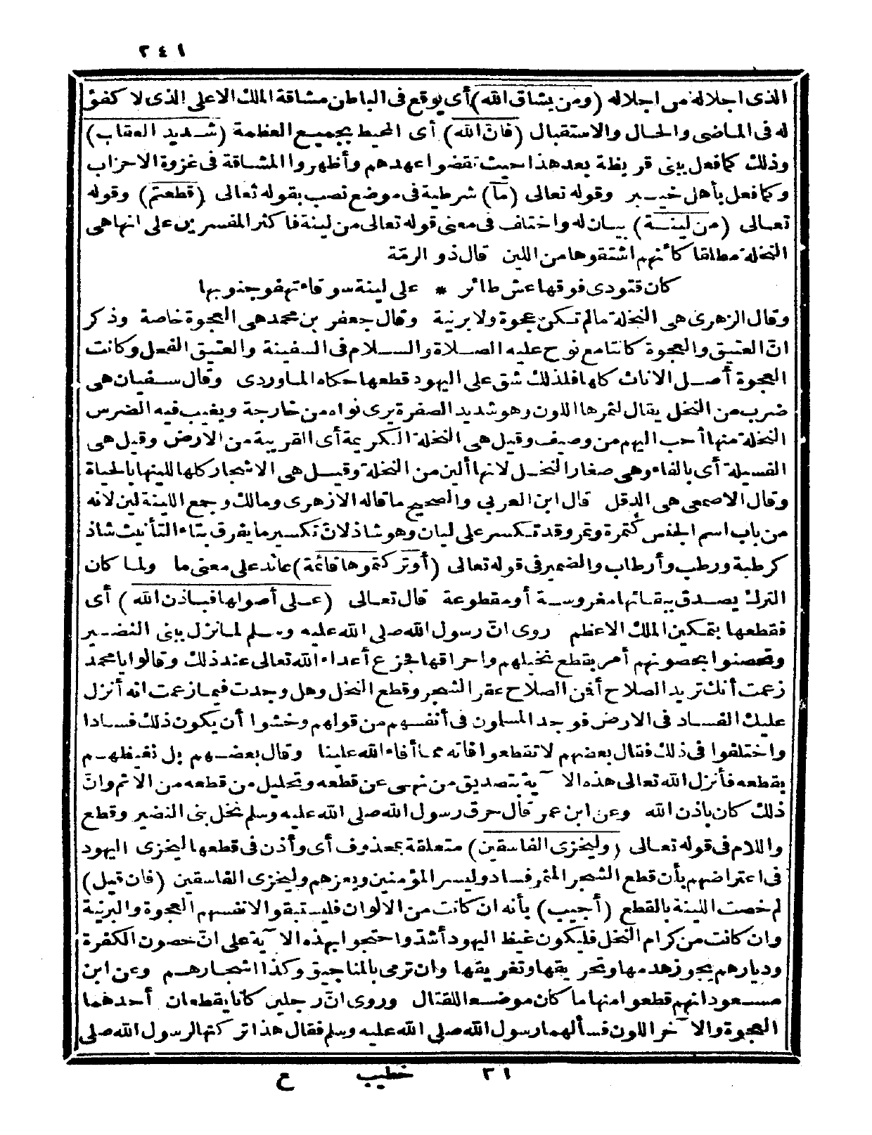 واحتجوا بهذه الآية على أنّ حصون الكفرة وديارهم يجوز هدمها وتحريقها وتغريقها، وأن ترمى بالمناجيق، وكذا أشجارهم. وعن ابن مسعود: أنهم قطعوا منها ما كان موضعاً للقتال، وروي: أنّ رجلين كانا يقطعان أحدهما العجوة والآخر اللون فسألهما رسول الله صلى الله عليه وسلم فقال: هذا تركتها لرسول الله صلى