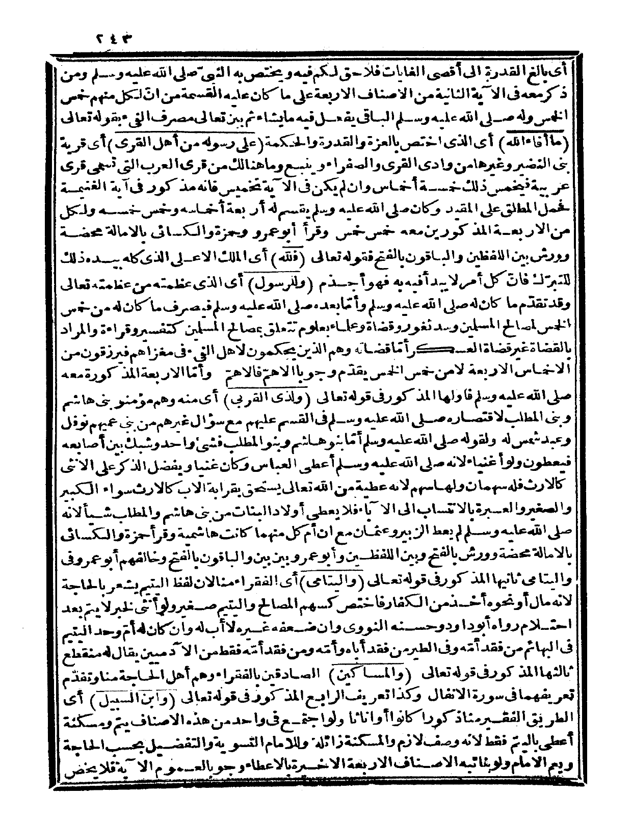 وقرأ حمزة والكسائي بالإمالة محضة، وورش بالفتح وبين اللفظين، وأبو عمرو بين بين، والباقون بالفتح، وخالفهم أبو عمرو في واليتامى. ثانيها: المذكور في قوله تعالى: {واليتامى} أي: الفقراء منا لأن لفظ اليتيم يشعر بالحاجة لأنه مال أو نحوه أخذ من الكفار فاختص كسهم المصالح، واليتيم صغير ولو أنثى لخبر «لا يتم بعد احتلام» رواه أبو داود وحسنه النووي وإن ضعفه غيره لا أب له، وإن كان له أمّ. وحد اليتيم في البهائم من فقد أمّه، وفي الطير من فقد أباه وأمّه، ومن فقد أمّه فقط من الآدميين يقال له: منقطع. ثالثها: المذكور في قوله تعالى: {والمساكين} الصادقين بالفقراء، وهم أهل الحاجة منا وتقدّم تعريفهما في سورة الأنفال، وكذا تعريف الرابع المذكور في قوله تعالى: {ابن السبيل} أي: الطريق الفقير منا ذكوراً كانوا أو إناثاً، ولو اجتمع في واحد من هذا الأصناف يتم ومسكنة أعطي باليتم فقط، لأنه وصف لازم والمسكنة زائلة، وللإمام التسوية والتفضيل بحسب الحاجة ويعم الإمام ولو بنائبه الأصناف الأربعة الأخيرة بالأعطاء وجوباً لعموم الآية فلا يخص