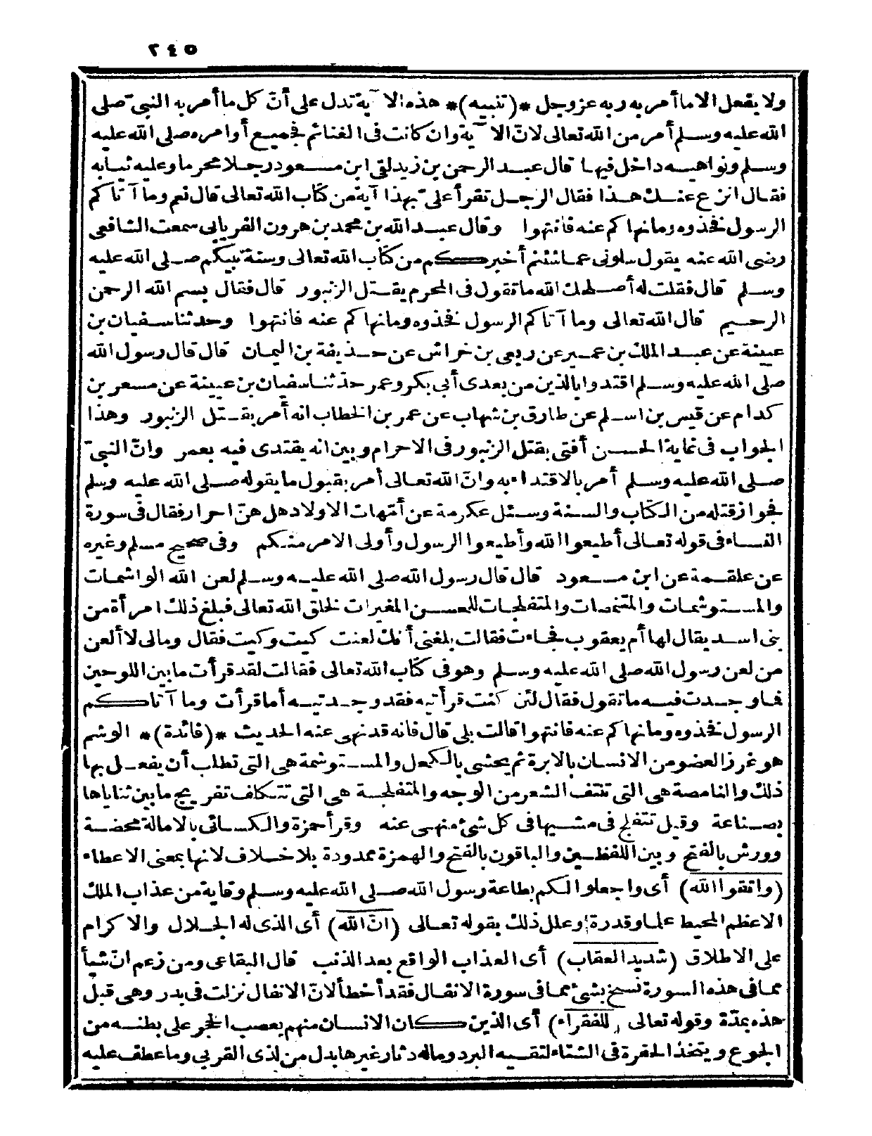 وفي صحيح مسلم وغيره عن علقمة عن ابن مسعود قال: قال رسول الله صلى الله عليه وسلم «لعن الله الواشمات والمستوشمات، والمتنمصات، والمتفلجات للحسن المغيرات لخلق الله تعالى» فبلغ ذلك امرأة من بني أسد يقال لها: أم يعقوب فجاءت فقالت: بلغني أنك لعنت كيت وكيت، فقال وما لي لا ألعن من لعن رسول الله صلى الله عليه وسلم وهو في كتاب الله تعالى فقالت: لقد قرأت ما بين اللوحين فما وجدت فيه ما تقول فقال: لئن كنت قرأتيه فقد وجدتيه أما قرأت {وما آتاكم الرسول فخذوه وما نهاكم عنه فانتهوا} قالت: بلى، قال: فإنه قد نهى عنه الحديث.